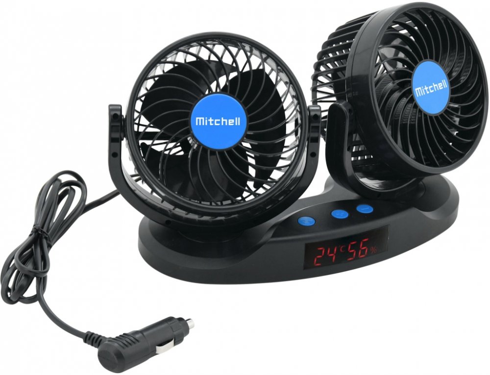 Napájení 12 V ze zásuvky autozapalovače. Oba ventilátory průměru 13 cm lze nezávisle na sobě natočit libovolným směrem. Sestava ventilátorů se upe...