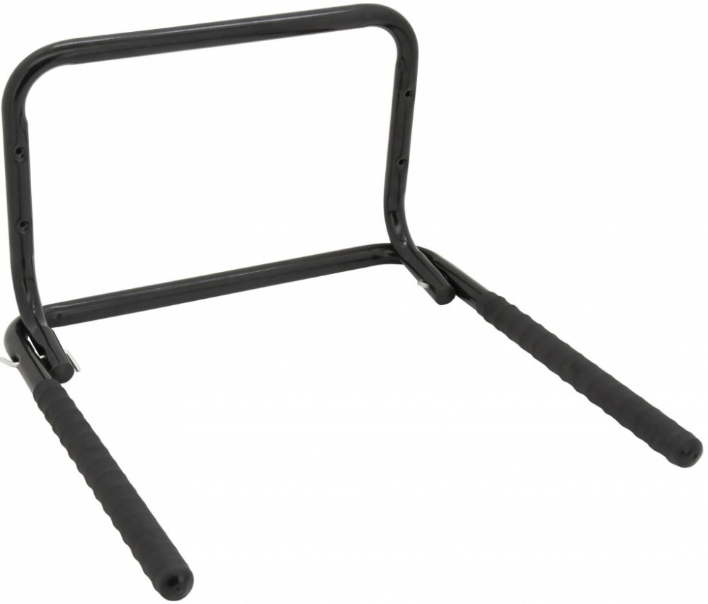 Celokovový držák je tvořen sklápěcím zdvojeným ramenem s vroubkovaným, pogumovaným zakončením pro bezpečné uchycení rámu dvou bicyklů.