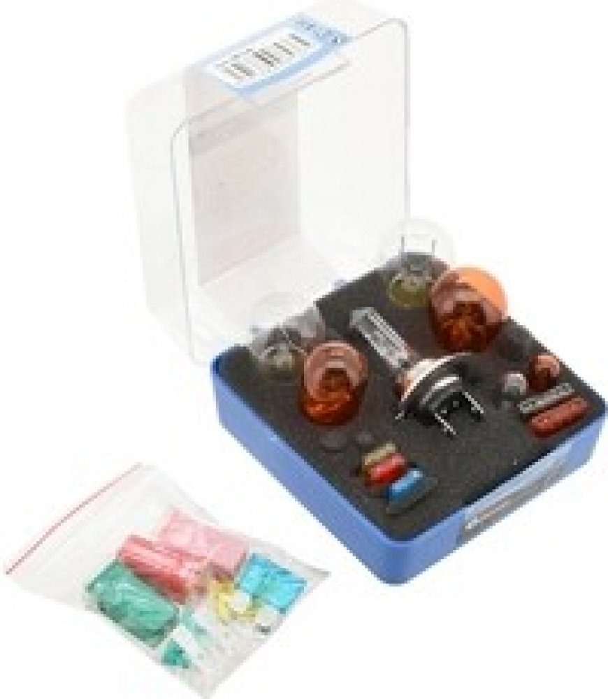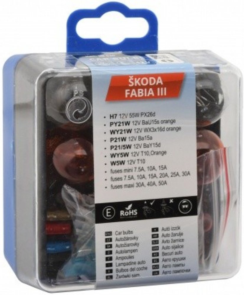 Servisní sada 12V žárovek a pojistek pro Škoda Fabia III., homologace E. Uloženo v plastovém boxu.