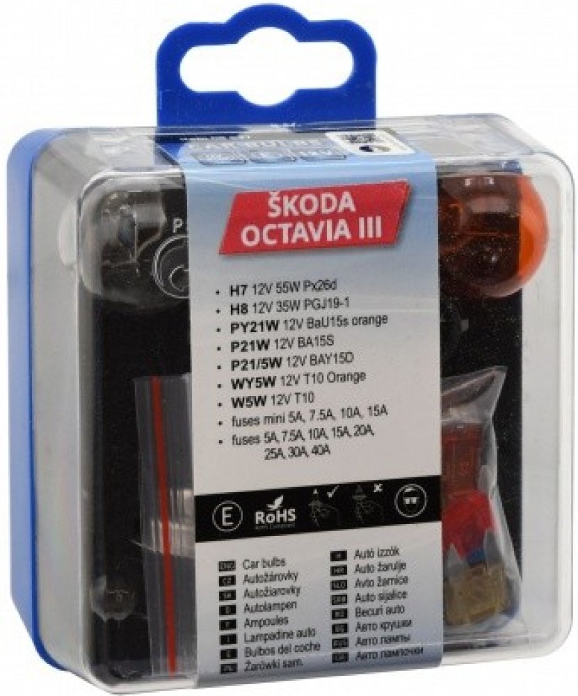 Servisní sada 12V žárovek a pojistek pro Škoda Octavia III., homologace E. Uloženo v plastovém boxu.