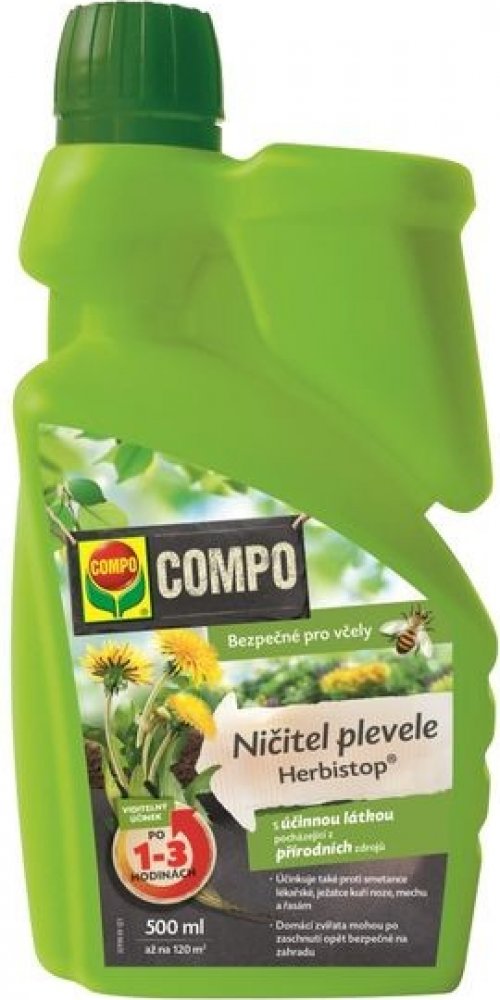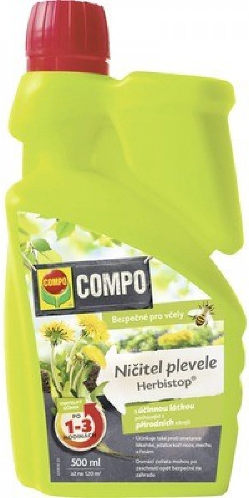 COMPO Ničitel plevele Herbistop s účinnou látkou pocházející z přírodních zdrojů likviduje jednoděložné i dvouděložné plevele, mechy a řasy v průběhu několika málo hodin. Pro použití mezi okrasnými květinami a dřevinami, ovocnými rostlinami a zeleninou. Účinky lze spatřit již po 1-3 hodinách.