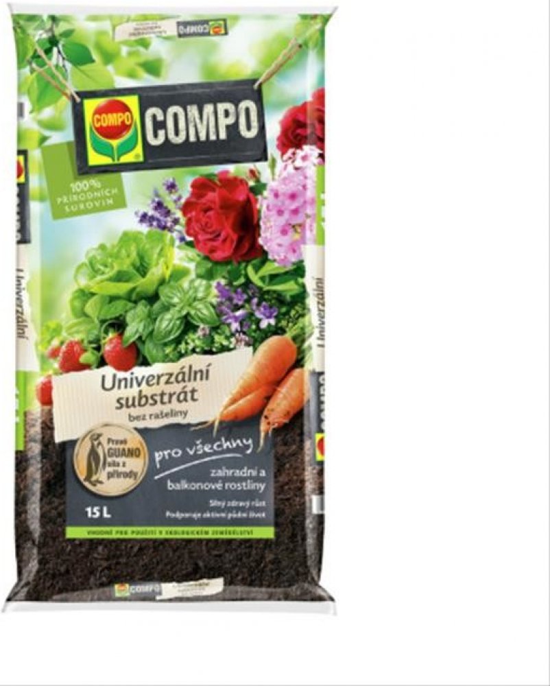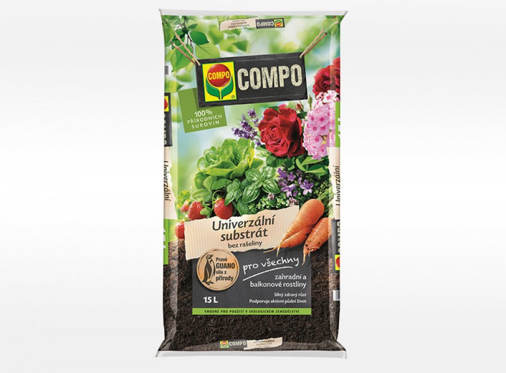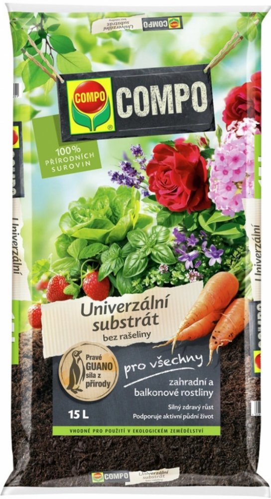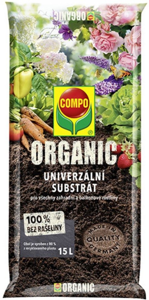 Substráty a kompost COMPO Kvalitní pěstební substrát je základem zdravého růstu vašich rostlin. Poskytuje oporu kořenům, dokáže zadržet vodu a živiny a disponuje dostatečně kyprou a vzdušnou strukturou, aby umožnil kořenům dýchat. A jelikož má každá rostlina jiné nároky, není substrát jako substrát. Univerzální substrát bez rašeliny COMPO ORGANIC - Vysoce kvalitní univerzální substrát bez rašeliny pro celoroční použití pro všechny okrasné rostliny stejně jako pro zeleninu, ovoce nebo bylinky - 100% přírodních surovin v souladu s nařízením ES , vhodné pro použití v ekologickém zemědělství - Obzvláště vysoký podíl zahradního humusu a pravého COMPO guána zaručuje rostlinám optimální přísun živin - Pro krásné květy a zdravé plody Místo aplikace a období použití - Interiér - Zahrada - Balkón a terasa - Skleník - Březen-říjen