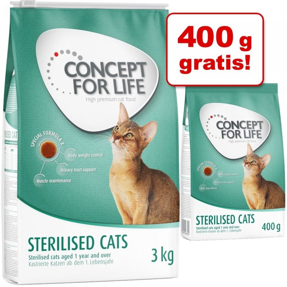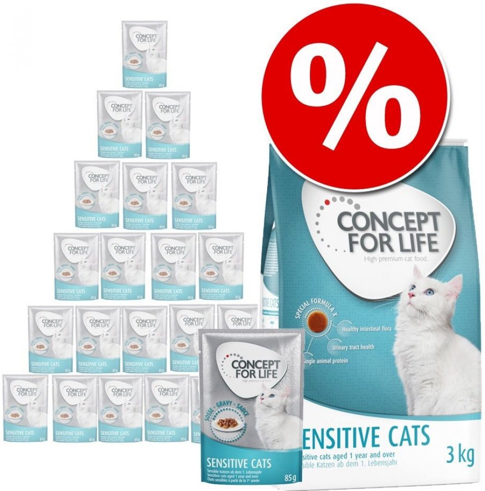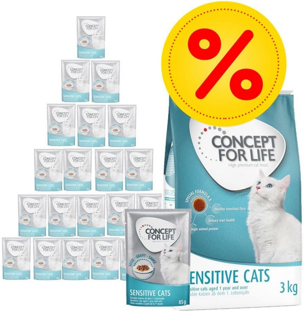 Základem dlouhého a aktivního kočičího života je druhově vhodná a vyvážená strava. Některé kočky jsou velmi citlivé a mají citlivý trávicí trakt. Proto potřebují velmi dobře stravitelné granule, aby mohly ideálně vstřebat všechny živiny. CONCEPT FOR LIFE Sensitive Cats - přizpůsobené dospělým kočkám s citlivým zažíváním: Pouze jeden zdroj živočišných bílkovin: Receptura s kuřecím jako jediným zdrojem živočišných bílkovin je ideální pro kočky citlivé na výživu a kočky s intolerancemi. Pouze jeden zdroj sacharidů: Rýže jako zdroj sacharidů je lehce stravitelná a může přispět ke zdravému trávení. Zdravá střevní flóra: Obsažená vláknina z psyllia regulující trávení a prebiotický inulin z čekanky mohou podpořit zdravou střevní flóru. Lesklá srst: Obsažený komplex vitamínů B v kombinaci s mědí a organicky vázaným zinkem, stejně jako cenné mastné kyseliny omega 3 a omega 6 a biotin mohou podpořit lesklou srst a hebkou pokožku Vaší kočky. Zdraví močových cest: DL-methionin obsažený v krmivu může snížit pH moči. To může podpořit zdraví močových cest. Funkce Anti-Hairball: Funkce Anti-Hairball může omezit tvorbu bezoárů v žaludku a pomáhá přirozenému a šetrnému vylučování spolknutých chlupů. Proti zápachu stolice: Přírodní rostlinný extrakt z Yucca schidigera má funkci redukce zápachu stolice. Zdraví zubů: Komplex Stay-Clean™ dokáže omezit tvorbu zubního kamene díky vysoce rozpustnému vitamínu C. Rýže jako dobře stravitelný zdroj sacharidů - bez pšenice, kukuřice nebo sóji. CONCEPT FOR LIFE - nejvyšší kvalita ušitá na míru pro Vaši kočku: Vědecky podložený výživový koncept, u kterého se v popředí nachází individuální pohoda a výživově fyziologické požadavky Vaší kočky v každé životní fázi. Hlavními složkami jsou funkční suroviny nejvyšší kvality, které se vyznačují velmi dobrou stravitelností. Speciální FORMULA X aktivně podporuje celoživotní pohodu a zajišťuje maximální funkčnost. Přirozené složení přizpůsobené výživovým potřebám Vaší kočky pro optimální komplexní péči a vitalitu Vašeho mazlíčka. Obzvláště chutná receptura s čerstvým masem. Concept for Life - stvořeno pro život. Znáte již mokré krmivo od Concept for Life? Concept for Life Sensitive Cats v omáčce nebo Concept for Life Sensitive Cats v želé je ideálním doplňkem granulí Concept for Life Sensitive Cats a je k dispozici v následujících baleních: 12 x 85 g, 24 x 85 g a 48 x 85 g. Kombinace suchého a mokrého krmiva ještě zvýrazňuje pozitivní vlastnosti obou druhů krmiva. Mokré krmivo je velmi chutné, dodává důležité živiny a díky vysokému obsahu tekutiny podporuje zdraví ledvin a močových cest. Kapsička 85 g krmiva pokryje téměř polovinu potřebného denního množství tekutin! Suché krmivo oproti tomu je vhodné rozdělit do menších dávek v průběhu celého dne. Mimo to, že pečuje o zuby a dásně, obsahuje vysoký podíl živin jako jsou bílkoviny nebo vláknina, což je důležitou předností suchého krmiva! Četné studie potvrzují: kombinace suchého a mokrého krmiva odpovídá přirozenému stravování a díky němu bude Vaše kočka zdravá!