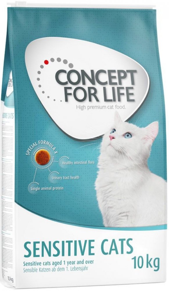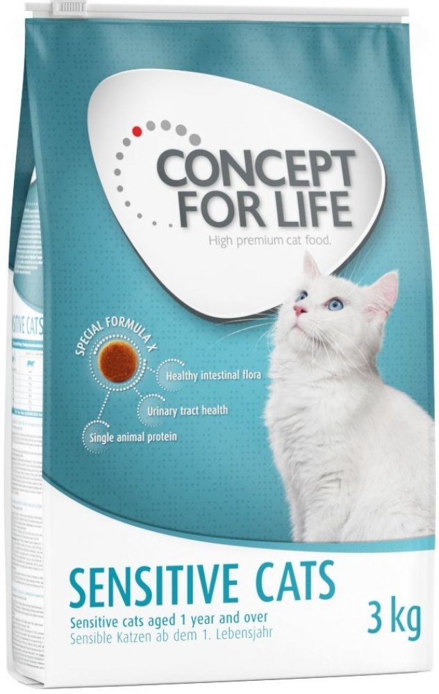 Základem dlouhého a aktivního kočičího života je druhově vhodná a vyvážená strava. Některé kočky jsou velmi citlivé a mají citlivý trávicí trakt. Proto potřebují velmi dobře stravitelné granule, aby mohly ideálně vstřebat všechny živiny. CONCEPT FOR LIFE Sensitive Cats - přizpůsobené dospělým kočkám s citlivým zažíváním: Pouze jeden zdroj živočišných bílkovin: Receptura s kuřecím jako jediným zdro...