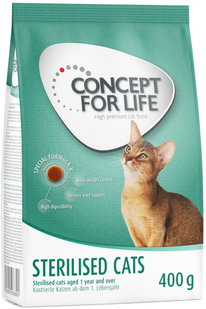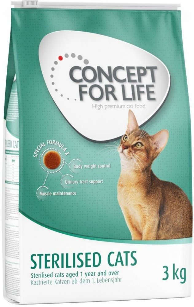 Základem dlouhého a aktivního kočičího života je druhově vhodná a vyvážená strava. V důsledku hormonální změny mají kastrované kočky výrazně větší chuť k jídlu a zároveň se snižuje jejich energetická spotřeba. To způsobuje, že kastrované kočky žerou více, než kolik skutečně potřebují. To může rychle vést k nadváze. Kastrované kočky mohou být navíc vystaveny zvýšenému riziku vzniku močových kamenů, protože obvykle méně pijí. CONCEPT FOR LIFE Sterilised Cats - přizpůsobené potřebám kastrovaných koček od 1 roku: Kontrola tělesné hmotnosti: Zvýšený obsah bílkovin v kombinaci s L-karnitinem, stejně jako upravený obsah tuku (-45 %) (ve srovnání s krmivem CONCEPT FOR LIFE All Cats) a energie může při přizpůsobeném způsobu krmení pozitivně ovlivnit udržení ideální hmotnosti a zabránit jejímu nárůstu. Zdraví močových cest: DL-methionin obsažený v krmivu může snížit pH moči. To může podpořit zdraví močových cest. Zachování svalové hmoty: Zvýšený obsah bílkovin 35 % spolu s L-karnitinem může podpořit udržení funkční svalové hmoty. Velmi dobrá stravitelnost: Díky vysoce stravitelným bílkovinám v kombinaci s rýží je dosaženo optimální stravitelnosti. Kůže a srst: Obsažený komplex vitamínů B v kombinaci s mědí a organicky vázaným zinkem, stejně jako cenné mastné kyseliny omega 3 a omega 6 mohou podpořit lesklou srst a pružnou pokožku Vaší kočky. Funkce Anti-Hairball: Funkce Anti-Hairball může omezit tvorbu bezoárů v žaludku a pomáhá přirozenému a šetrnému vylučování spolknutých chlupů. Proti zápachu stolice: Přírodní rostlinný extrakt z Yucca schidigera má funkci redukce zápachu stolice. Zdraví zubů: Komplex Stay-Clean™ dokáže omezit tvorbu zubního kamene díky vysoce rozpustnému vitamínu C. Rýže jako dobře stravitelný zdroj sacharidů - bez pšenice, kukuřice nebo sóji CONCEPT FOR LIFE - nejvyšší kvalita ušitá na míru pro Vaši kočku: Vědecky podložený výživový koncept, u kterého se v popředí nachází individuální pohoda a výživově fyziologické požadavky Vaší kočky v každé životní fázi. Hlavními složkami jsou funkční suroviny nejvyšší kvality, které se vyznačují velmi dobrou stravitelností. Speciální FORMULA X aktivně podporuje celoživotní pohodu a zajišťuje maximální funkčnost. Přirozené složení přizpůsobené výživovým potřebám Vaší kočky pro optimální komplexní péči a vitalitu Vašeho mazlíčka. Obzvláště chutná receptura s čerstvým masem Concept for Life - stvořeno pro život. Znáte již mokré krmivo od Concept for Life? Concept for Life Sterilised Cats v omáčce nebo v želé je ideálním doplňkem granulí Concept for Life Sterilised Cats a je k dispozici v následujících baleních: 12 x 85 g, 24 x 85 g a 48 x 85 g. Kombinace suchého a mokrého krmiva ještě zvýrazňuje pozitivní vlastnosti obou druhů krmiva. Mokré krmivo je velmi chutné, dodává důležité živiny a díky vysokému obsahu tekutiny podporuje zdraví ledvin a močových cest. Kapsička 85 g krmiva pokryje téměř polovinu potřebného denního množství tekutin! Suché krmivo oproti tomu je vhodné rozdělit do menších dávek v průběhu celého dne. Mimo to, že pečuje o zuby a dásně, obsahuje vysoký podíl živin jako jsou bílkoviny nebo vláknina, což je důležitou předností suchého krmiva! Četné studie potvrzují: kombinace suchého a mokrého krmiva odpovídá přirozenému stravování a díky němu bude Vaše kočka zdravá! Odpovídající mokré krmivo ke granulím Concept For Life Sterilised Cats najdete zde: Concept for Life Sterilised v omáčce Concept for Life Sterilised v želé