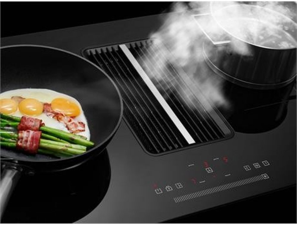 Varná deska je vybavená odsavačem par, který funguje jako digestoř. Díky nízkému umístění a vysokému výkonu odsává všechny pachy dříve, než se stihnou rozptýlit po kuchyni. Na výběr máte 8 stupňů odsávání a 2 způsoby odtahu – odvod páry potrubním systémem ven z místnosti a režim recirkulace. Pára vede přes 2 uhlíkové filtry, které zachycují zápach. Filtrace vzduchu je tedy efektivní a lepší než u digestoří s jedním filtrem.