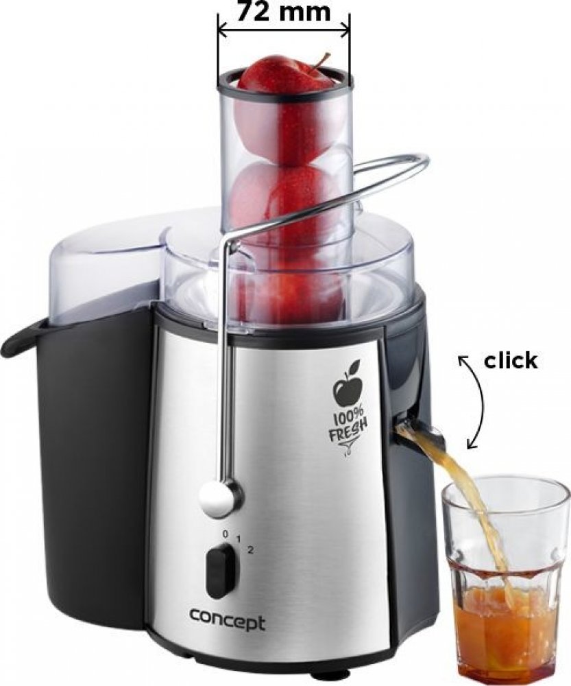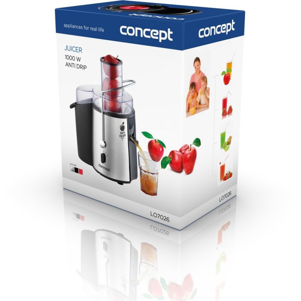 Odšťavňovač FRESH Concept LO7026 Nejprodávanější odšťavňovač 2019 Nejprodávanější odšťavňovač v sekci odstředivých odšťavňovačů v roce 2019 na českém trhu. Jsme rádi, že si řada zákazníků vybrala v loňském roce právě naše odstředivé odšťavňovače LO7026/27/28. Patříme mezi značky, které se zaměřují na zdravý životní styl a snažíme se přinášet do rodin produkty, které zlepšují zdraví. Ohromující výkon Ovocné šťávy a koktejly z ovoce vynikají nejen svou lahodnou chutí, ale především vysokým obsahem vitamínů, minerálů a dalších biologicky významných látek. Potěšte se lahodnou chutí 100% ovocné nebo zeleninové šťávy z odšťavňovače Concept. Odšťavňovač Concept s příkonem 1000 W Vám umožní připravit najednou až 1 l čerstvé šťávy. XXL plnicí otvor Už Vás nebaví trávit v kuchyni veškerý svůj čas? Chcete mít zdravou čerstvou šťávu denně na svém stole? Tak právě pro Vás je tu lis na ovoce a zeleninu od Conceptu. Díky svému 72 mm velkému plnicímu otvoru ušetříte spoustu času. Nemusíte se zdržovat zbytečným krájením ovoce, zvládne i celé plody. Ani kapka nazmar! Praktický ANTIDRIP Vám umožní výměnu nádoby na šťávu, aniž byste si ušpinili kuchyňskou linku nebo museli přestat odšťavňovat. Jednoduše překlopíte antidrip, vyměníte sklenici a zase odklopíte uzávěr. Jak jednoduché! Zvládne cokoli Pro odšťavňování bez námahy nabízí odšťavňovač 2 nastavení rychlosti pro měkké plody s vyšším obsahem šťáv (citrusy, broskve atd.) a tvrdé plody s nižším obsahem šťáv (mrkev jablka atd.). Z počátku by měl být nastaven na rychlost nižší a dle druhu ovoce či zeleniny jeho rychlost zvýšit. Jistě oceníte u odšťavňovače rozebiratelnost a snadné čištění. Bezpečnost O bezpečnost při práci se nám stará důmyslný bezpečnostní systém, který zabrání zapnutí spotřebiče pokud není vše ve správné poloze. Pro větší bezpečnost lze přístroj zapnout až po uzavření nádoby nerezovou svorkou. Díky protiskluzovým nožičkám se při přípravě džusů drží spotřebič pevně na lince a tím zajistí bezpečnou přípravu nápojů. Vyberte si ten pravý Díky atraktivnímu vzhledu odšťavňovač už nebudete schovávat do skříně. Můžete si vybrat hned ze tří barevných variant. Základní stříbrná, grafitově černá nebo třeba přitažlivá červená? Volbu necháme jen na Vás. Základní popis: Velikost plnicího otvoru: 7,2 cm Přístroj je plně rozebiratelný a díky tomu se snadno čistí Nádoba na šťávu: 1 l BPA free Zásobník na dužninu: 1,8 l Snadné čištění Bezpečnostní systém Nůž z nerezové oceli Antidrip Pěchovadlo Protiskluzové nožičky Prostor pro uložení kabelu Barva: černá + nerez Rychlost: max. 16.800 ot./min. Příkon: 1000 W Napětí: 220 - 240 V