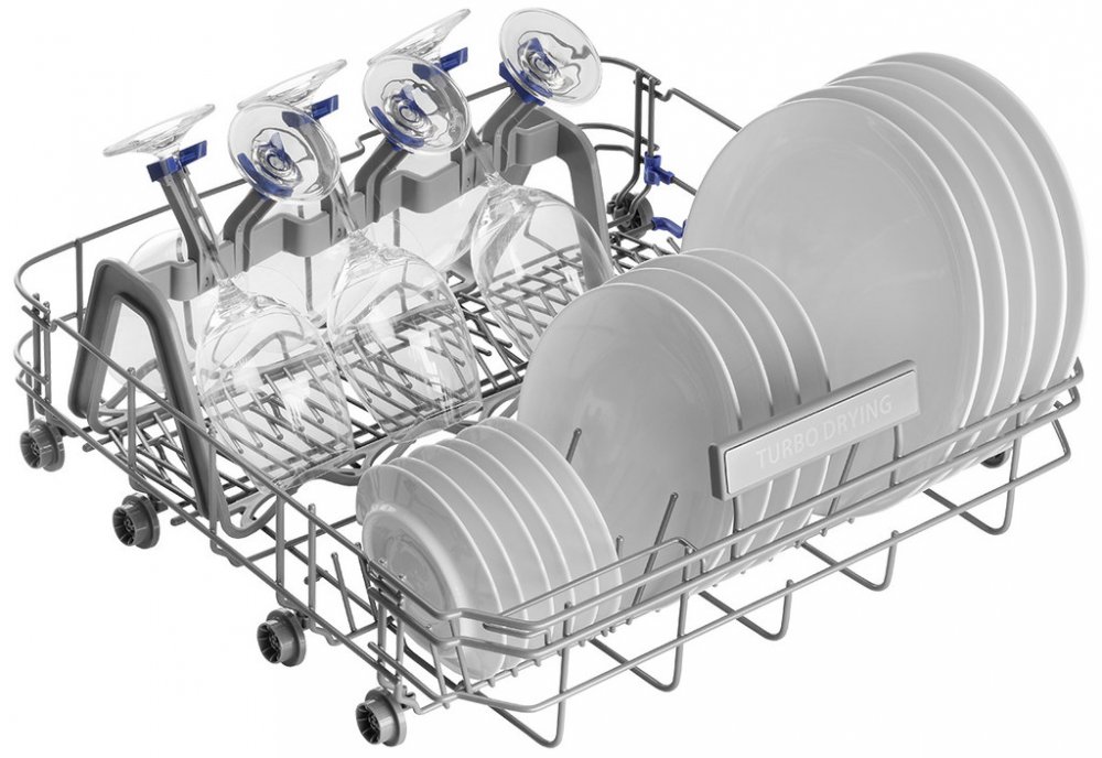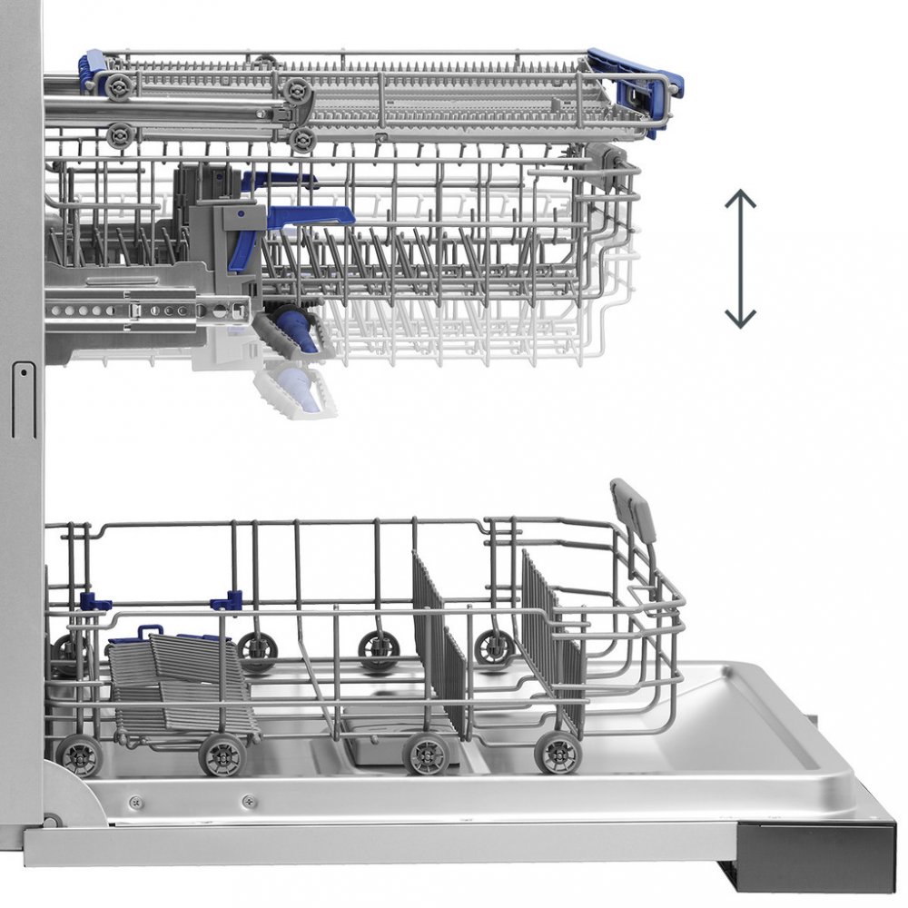 Dalším prvkem, který vám usnadní život, je variabilní příborová zásuvka. Pokud potřebujete umýt rozměrnější nádobí, jednoduše příborovou zásuvku přesunete, a tím vám vznikne větší prostor v horním koši, kam umístíte téměř cokoli. Těžko budete hledat nádobí, které by se nevešlo.