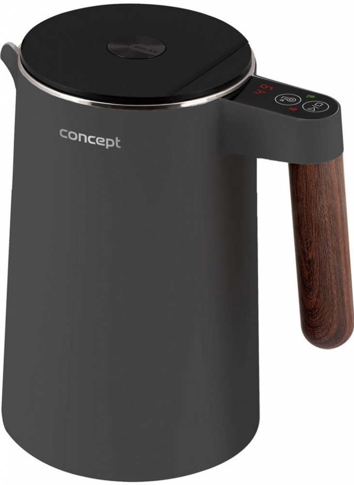 Rychlovarná konvice Concept RK3305 Norwood si najde místo v každé domácnosti. Její atraktivní design podtrhuje matné tělo v tmavě šedé barvě doplněné o elegantní madlo v designu dřeva. Velice elegantně působí i minimalistický podstavec, na kterém je konvice usazená. S objemem 1,5 l s ní pohodlně připravíte až 6 šálků vašeho oblíbeného horkého nápoje.
