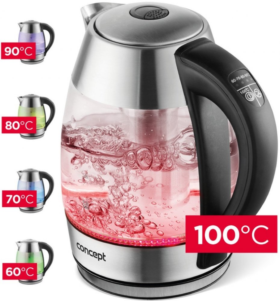 Rychlovarná konvice s regulací teploty 1,8 l s nastavením teplot, čajovým sítkem a barevným podsvícením Concept RK4066 Perfektně vidíte, co vaříte Konvice je vyrobená z velmi pevného, zdravotně nezávadného borosilikátového skla, které je odolné proti skvrnám. Jednou z největších předností konvičky je celonerezové hrdlo, které zabezpečí větší odolnost při neopatrné manipulaci během plnění vodou. Tato čirá kráska a vodoznak Vám zajistí dokonalý přehled o tom, kolik vody právě vaříte. Hlavní předností konvice je funkce regulování teploty: můžete si vybrat 60°C, 70°C, 80°C, 90°C nebo 100°C. Konvice Vás upozorní akustickým signálem, že je hotovo a voda je připravená na Vámi zvolenou teplotu. Každodenní práci Vám ulehčí naprosto snadné a intuitivní ovládání. 60°C a 70 °C Připravujete několikrát za den různé druhy dětských kašiček a nápojů pro Vašeho malého miláčka? Tak určitě oceníte možnost nastavení teploty ohřevu vody na pouhých 60°C, což Vám ušetří spoustu práce a času. Při ohřevu vody na tuto teplotu bude Vaše konvice svítit příjemnou zelenou barvou. Modrou barvou budou svítit diody na Vaší konvici při ohřevu vody na 70 °C. Tato teplota je naprosto ideální pro přípravu zeleného čaje. Už nebudete muset čekat, až Vám uvařená voda vychladne na ideální teplotu. 80°C a 90 °C Příjemná oranžová barva rozzáří Vaši kuchyni při přípravě například žlutého čaje, či dalších druhů zelených čajů. Fialová je údajně barva inspirace. Popusťte uzdu své fantazii a připravte si i další spoustu nápojů, včetně instantní kávy, pro kterou je ideální teplota přípravy 90 °C 100°C a funkce KEEP WARM Lásku k turecké kávě, pro jejíž přípravu je ideální teplota kolem 100 °C, může značit červená barva. Tou si prosvítíte kuchyň, pokud si rychlovarnou konvici nastavíte právě na tuto teplotu. Toto klasické nastavení zajisté oceníte i při přípravě spousty druhů bylinných čajů. Konvice je také vybavená funkcí KEEP WARM - udržování teploty: stisknete tlačítko on/off po dobu tří sekund, poté se rozbliká červená dioda. Konvice bude vodu po dobu dvou hodin přihřívat tak, že termostat sepne vždy, když teplota vody klesne pod 85 °C. Pohodlí, bezpečnost a údržba Optimálně tvarované ústí konvice Vám umožní pohodlně plnit konvici vodou, aniž byste ji museli otevírat. Široké hrdlo oceníte i při nalévání do šálku. Konvici hravě otevřete pouhým stiskem jednoho tlačítka, které je umístěné na horní části víka. Široké tělo konvice umožňuje její snadné čištění, i sítko proti vodnímu kameni lze snadno vyjmout a umýt. Vaše konvice tak bude pořád zářit. Výhodou podstavce otočného o 360°C je, že konvici můžete na podstavec postavit z jakéhokoli úhlu. Konvice je vybavena trojnásobným bezpečnostním systémem. Ten Vám zaručí, že se konvice po dovaření vody sama vypne. Zapomněli jste nalít vodu do konvice? Žádný problém, konvice se vypne a po zchladnutí ji můžete znovu použít. Pokud sejmete konvici z podstavce a vrátíte, tak se sama už nezapne. Technické parametry: Objem: 1,8 Elegantní moderní design Bezspirálová skleněná nádoba s výztuží okolo hrdla Barevné LED podsvícení během doby provozu Volba teplot: : 60°C, 70°C, 80°C, 90°C a 100°C Kvalitní konektor Praktické otevírání víka pomocí tlačítka na víku 3-násobný bezpečnostní systém Automatické vypínání Vodoznak Barva: nerez + sklo Příkon: 1850 – 2200 W Napětí: 220 – 240 V