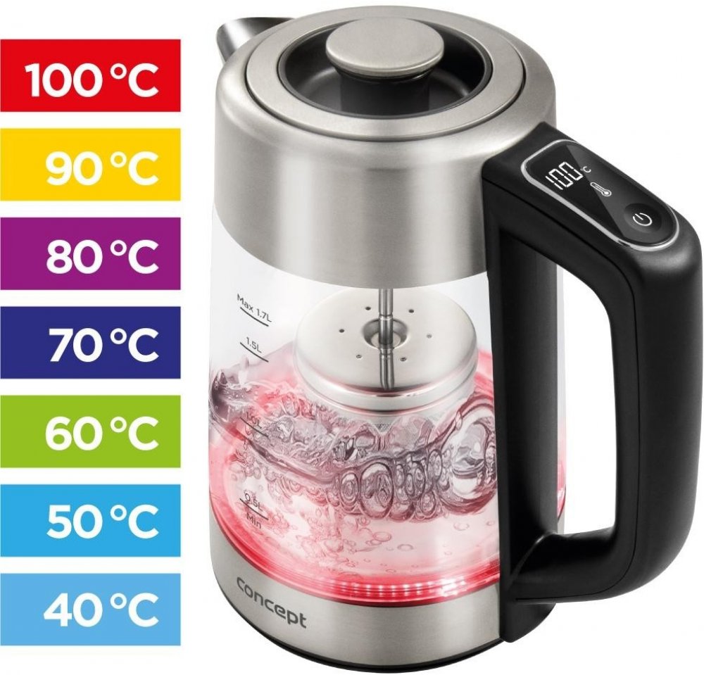 Konvice je vybavena digitálním ovládáním s nastavením teploty od 40 °C do bodu varu. Tuto funkci ocení nejen milovníci čaje a kávy, ale také rodiče s malými dětmi při přípravě dětské stravy. Skleněný design konvice je vybaven barevným podsvícením, které indikuje aktuální teplotu vody. Nechybí ani praktická funkce udržování teploty, která udržuje vodu na požadované teplotě.