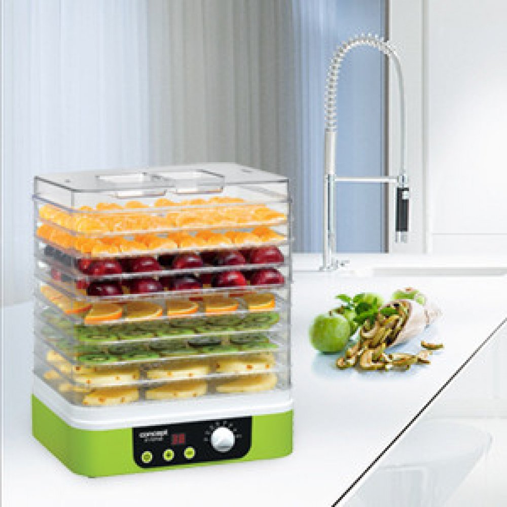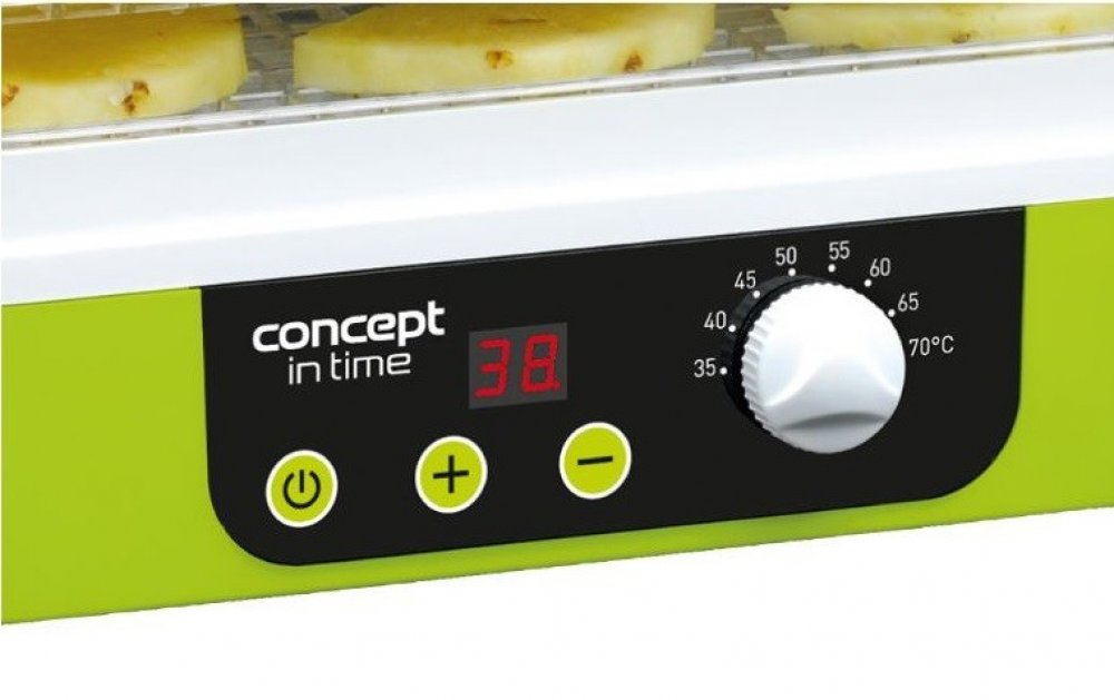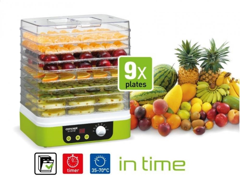 Sušička ovoce IN TIME s časovačem Concept SO1060 Regulace teploty od 35 do 70 °C Praktický obdélníkový tvar Časovač Uchovejte svou úrodu po celý rok Také máte radost z každého pěstitelského úspěchu v podobě ovoce a zeleniny? Předejděte tomu, že se vám bude obojí kupit v lednici či ve spíži a zpracujte je ještě začerstva – chutně a především zdravě. S praktickou sušičkou SO1060 si úrodu budete moci uschovat na pozdější časy. Ovoce, zelenina, houby, bylinky, těstoviny, maso ... fantazii se meze nekladou Sušení je jednou z nejšetrnějších metod zpracování úrody. Ovoce, zelenina, houby i bylinky si díky ní zachovávají vysoký obsah vitamínů a minerálů. Sušička vám pomůže uskladnit úrodu i ve větším objemu. Vaší fantazii se meze nekladou. SO1060 hravě zvládne usušit i těstoviny, květiny, maso, a lze ji použít i k výrobě chutných pamlsků pro domácí mazlíčky. Regulace teploty a času a rovnoměrné sušení ve všech patrech sušičky Sušička SO1060 IN TIME je vybavená praktickým časovačem. Můžete si nejen pohodlně regulovat teplotu od 35 do 70 °C, ale navíc si nastavíte i čas, po který budete sušit třeba svoje houbařské úlovky. Už se vám nestane, že byste na ně zapomněli, myslí totiž za vás. Po uplynutí nastavené doby sušení sušička zapípá a vypne se. Další vychytávkou je integrovaný ventilátor, který napomáhá rovnoměrnému sušení ve všech patrech sušičky. Speciálně tvarované mřížky napomáhají rovnoměrnému sušení. Výsledek bude jednoduše dokonalý. Šetřete místem i časem, díky hranatým platům, které lze mýt v myčce nádobí Prostor v kuchyni není nafukovací, a tak se úspora místa hodí vždy. Díky svému hranatému tvaru je tato sušička velmi skladná a šetří místo na vaší kuchyňské lince. Obdélníková plata se navíc vejdou do myčky nádobí, takže nemusíte trávit čas jejich údržbou. Technické parametry: Plynulá regulace nastavení teploty sušení: od 35 do 70°C Digitální časovač Ventilátor pro rovnoměrné sušení Obdélníková síta BPA free - zdravotně nezávadný materiál sušicích sít Počet sít: 9 ks Velikost sít: 31,3 x 25,5 cm Výška síta: 3,3 cm Tichý provoz: 46 dB(A) Pojistka proti přehřátí Barva: zelená + bílá Příkon: 230 - 260 W Napětí: 220-240 V Příslušenství: 9 hranatých sušicích sít