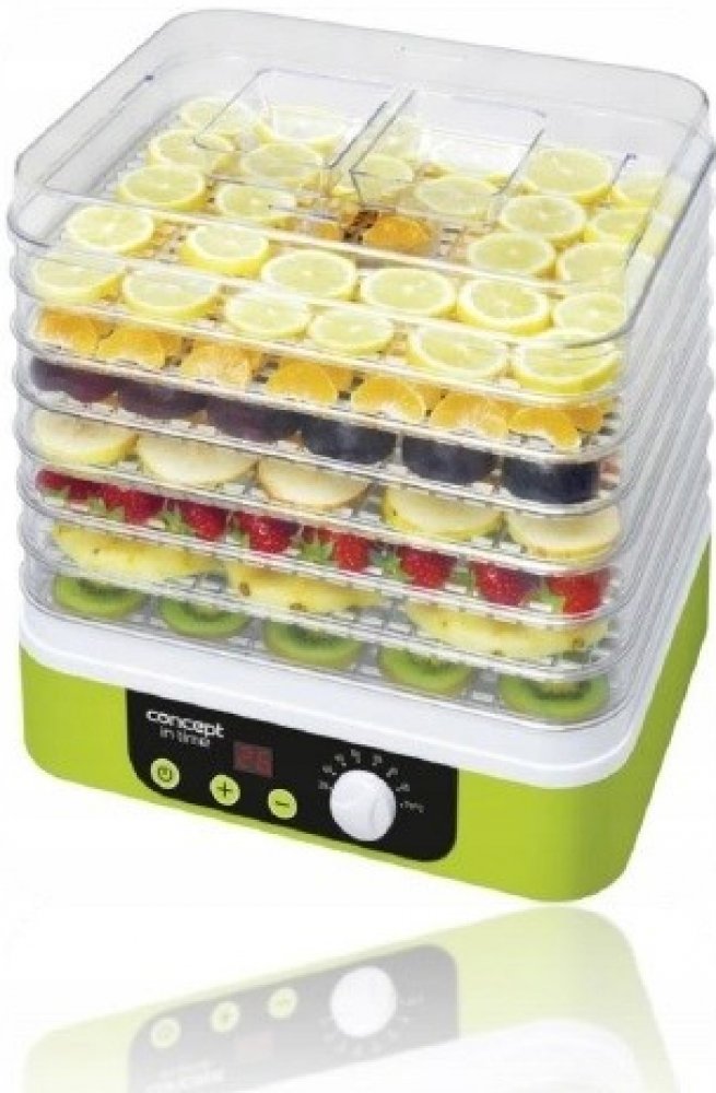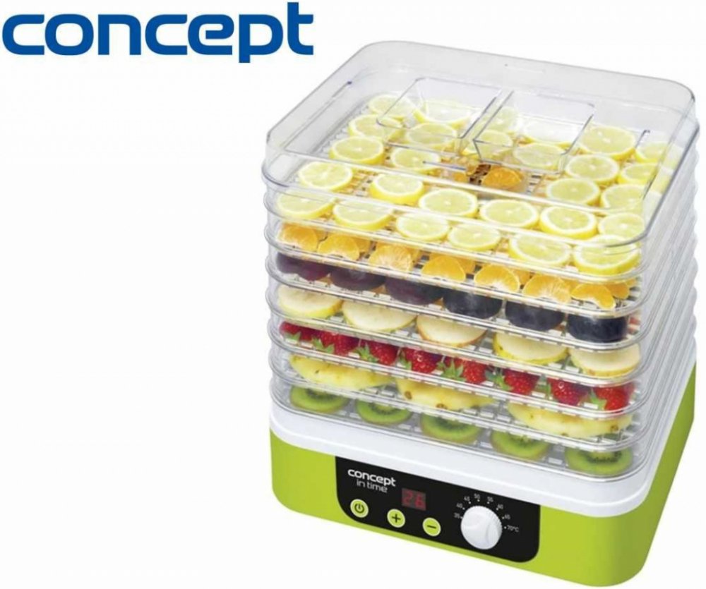Tato velkokapacitní digitální sušička Concept je vybavená devíti síty na sušení potravin o průměru 32 cm. Je vhodná na sušení ovoce, zeleniny, hub, bylin, květin, masa, ryb i těstovin. Příprava sušení probíhá velice jednoduše. Nakrájené potraviny se rozloží na sušící síta, nastaví se vhodná teplota (35 až 70 °C) a sušička se spustí. Ventilátor se postará o rovnoměrný proces sušení, pojistka proti přehřátí o maximálně bezpečný provoz. Sušící síta i pláty je možné mýt v myčce nádobí. Součástí tohoto modelu je navíc i praktický časovač, který vám přípravu ovoce ještě zjednoduší. Vypadá to, že nejtěžším úkolem bude nakrájet potraviny určené k sušení.