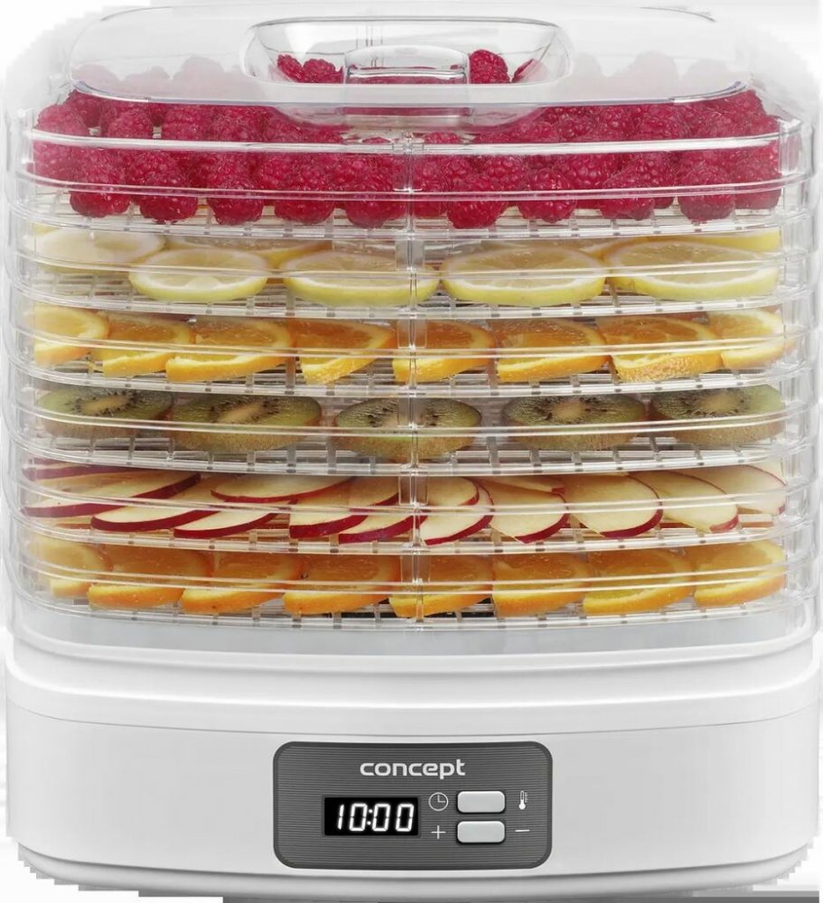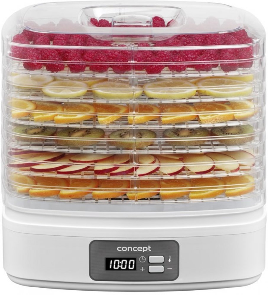 Sušička ovoce 260 W Concept SO2080 Kompaktní rozměry Univerzální nastavení plat Časovač Kompaktní sušička s 6 platy, které můžete mýt v myčce nádobí Sušička ovoce SO2080 s příkonem 260 W disponuje 6 transparentními platy. Díky svému hranatému tvaru je velmi skladná a šetří místo v kuchyni. Obdélníková plata se navíc vejdou do myčky nádobí, takže nemusíte trávit čas jejich údržbou. Regulace teploty a času umožní sušení podle vašich aktuálních potřeb Obsluhu sušičky SO2080 zvládne díky jednoduchému ovládání opravdu každý. Pomocí tlačítek nastavíte požadovanou teplotu sušení v rozmezí od 35 do 70 °C. Díky časovači, který lze nastavit až na 48 h, budete mít sušení plně pod kontrolou. Po uplynutí nastavené doby sušení se sušička sama vypne. Integrovaný ventilátor se postará o rovnoměrné sušení, a to ve všech patrech sušičky. Prodlužte život vašim potravinám a mlsejte zdravě po celý rok Sušení je jedna z mála metod uchování potravin, při které nedochází ke ztrátě důležitých vitamínů a minerálů. Proč tedy neprodloužit životnost potravinám, kterých máme aktuálně nadbytek? Např. malá špetka voňavého houbového prášku ze sušených hub dokáže udělat s vaším jídlem doslova zázraky. Sušit můžete téměř vše, od ovoce, zeleniny, přes těstoviny, květiny a maso. V sušičce snadno vyrobíte i výborné pamlsky pro vaše domácí mazlíčky. Univerzální nastavení plat pro sušení i větších kousků Vzdálenost mezi jednotlivými platy si můžete přizpůsobit. Záleží na způsobu sestavení. Pokud se vám např. některé ovoce do mezery mezi jednotlivými patry nevejde, jednoduše plato otočte o 180°, čímž docílíte většího prostoru. Technické parametry: Sušení ovoce, zeleniny, hub, bylin, květin, ryb a těstovin Zdravý způsob uchování potravin Vhodná pro každodenní využití Na výběr ze dvou výšek plat – možno sušit i objemnější potraviny Časovač Nastavení teploty 35-70 °C Počet plat: 6 Rozměr plata: 30,5 x 25 cm Příkon: 230-260 W Napětí: 230-240 V