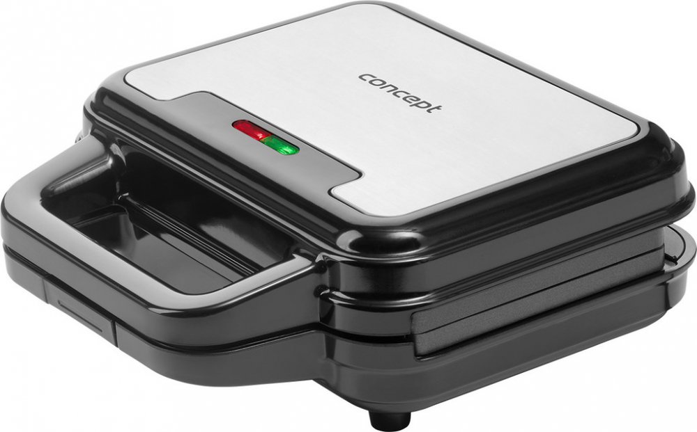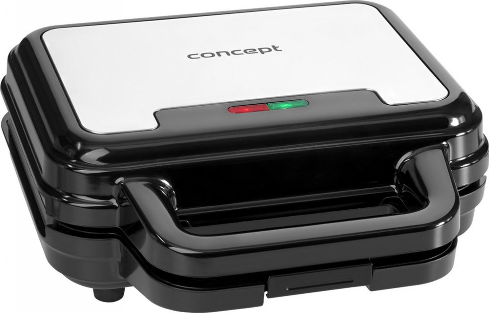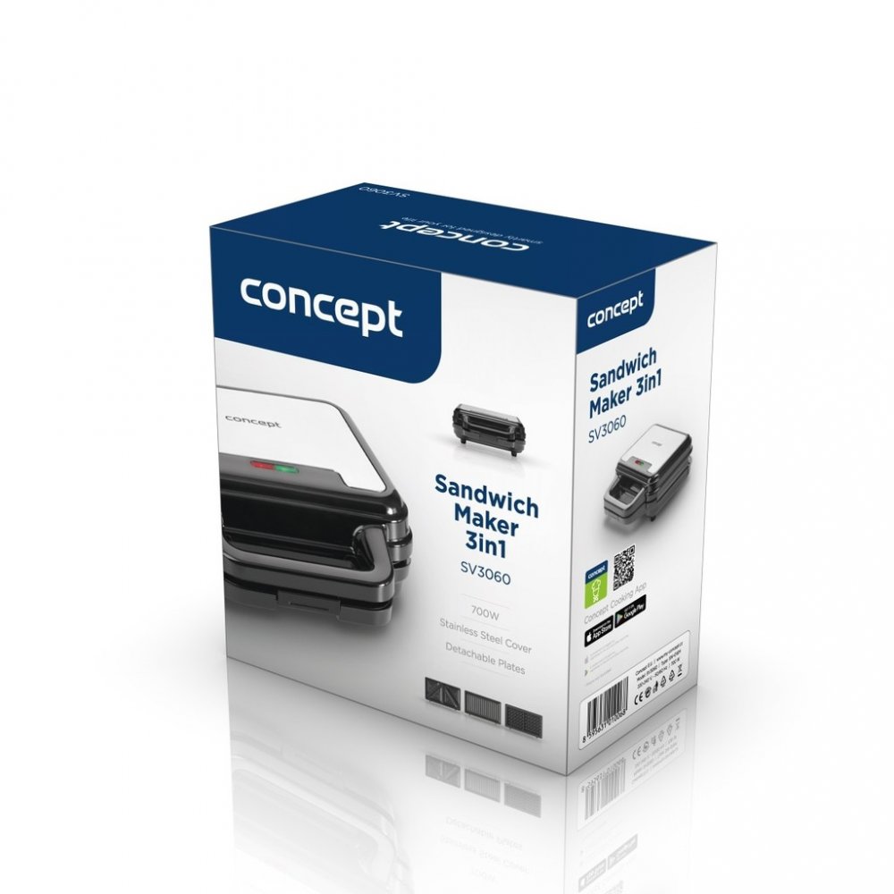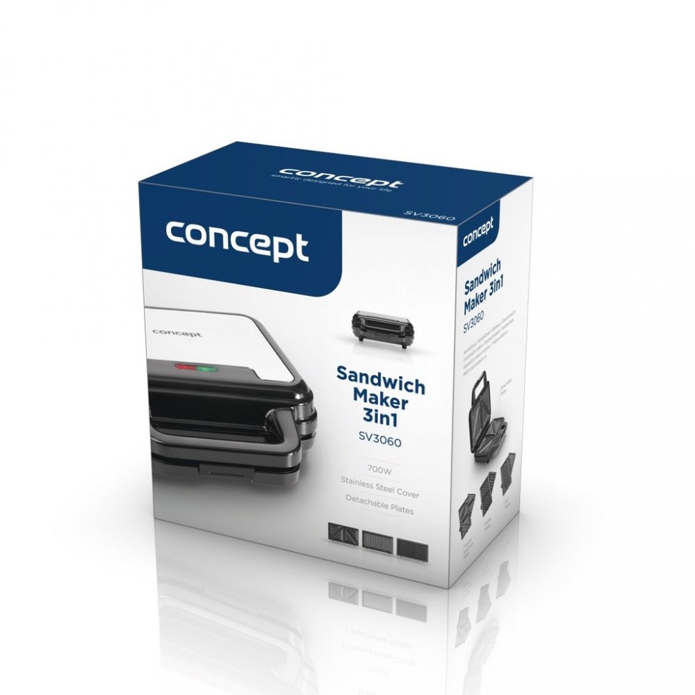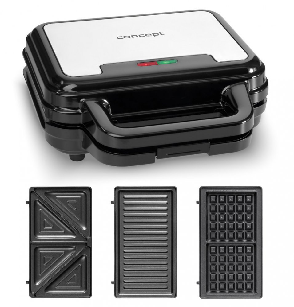 Sendvičovač s výměnnými deskami 3 v 1 700 W Concept SV3060 3 v 1 Rychlá příprava Snadná údržba 3 v 1 – sendvičovač, vaflovač, gril Multifunkční sendvičovač SV3060 vám pomůže s rychlou přípravou snídaně, svačiny i večeře. Díky třem vyměnitelným deskám v něm v okamžiku připravíte křupavé tousty, voňavé vafle nebo grilované pochoutky. Stačí si jen vybrat, na co máte zrovna chuť. V jednom těle získáte hned tři praktické pomocníky, kteří vám v kuchyni zaberou minimum místa. Velmi snadná údržba Plotny jsou opatřeny nepřilnavým povrchem, díky kterému se vám připravované pokrmy nebudou připalovat. Následné čištění proto bude velmi rychlé a jednoduché. Velkou výhodou je, že desky lehce oddělíte od těla sendvičovače. Po vychladnutí je stačí vložit do myčky nebo otřít vlhkým hadříkem či papírovou utěrkou. Bezpečnost Sendvičovač je opatřen světelnou kontrolkou nahřátí. Díky studenému držadlu se během práce nespálíte a bezpečnostní pant se postará o uzamčení desek během práce. Nechybí ani protiskluzové nožičky pro zajištění lepší stability. Technické parametry: Nerezový povrch v kombinaci s černým plastem Světelná signalizace nahřátí Výměnné plotny Snadná údržba Nepřilnavý povrch ploten Plotny je možné mýt v myčce 3 v 1: SENDVIČOVAČ, GRIL, VAFLOVAČ Příkon: 700 W Napětí: 220-240 V Rozměr: 23 x 23 x 9 cm