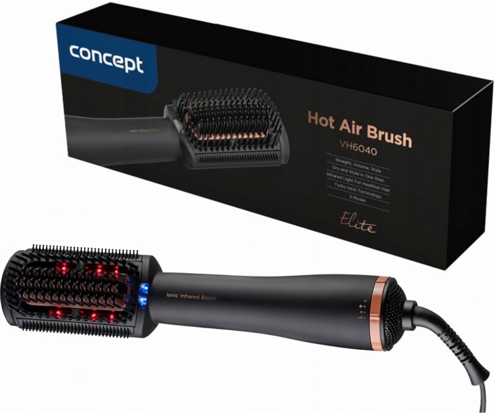 Žehlicí horkovzdušný kartáč na vlasy Ionic Infrared Boost Concept VH6040 Elite disponuje infračervenou a iontovou technologií, které přinášejí vysoce šetrnou péči o vlasy. Je vybaven 3 režimy, které zastanou práci běžného fénu, kulmofénu i žehličky na vlasy. Velkou předností je, že ho můžete používat na suché i mokré vlasy.