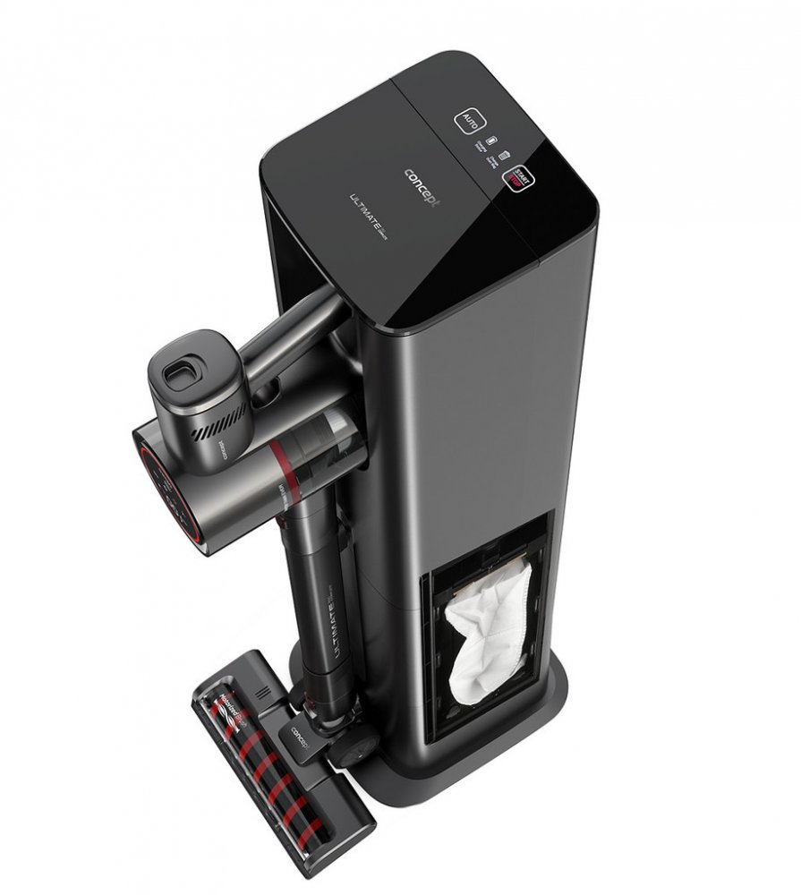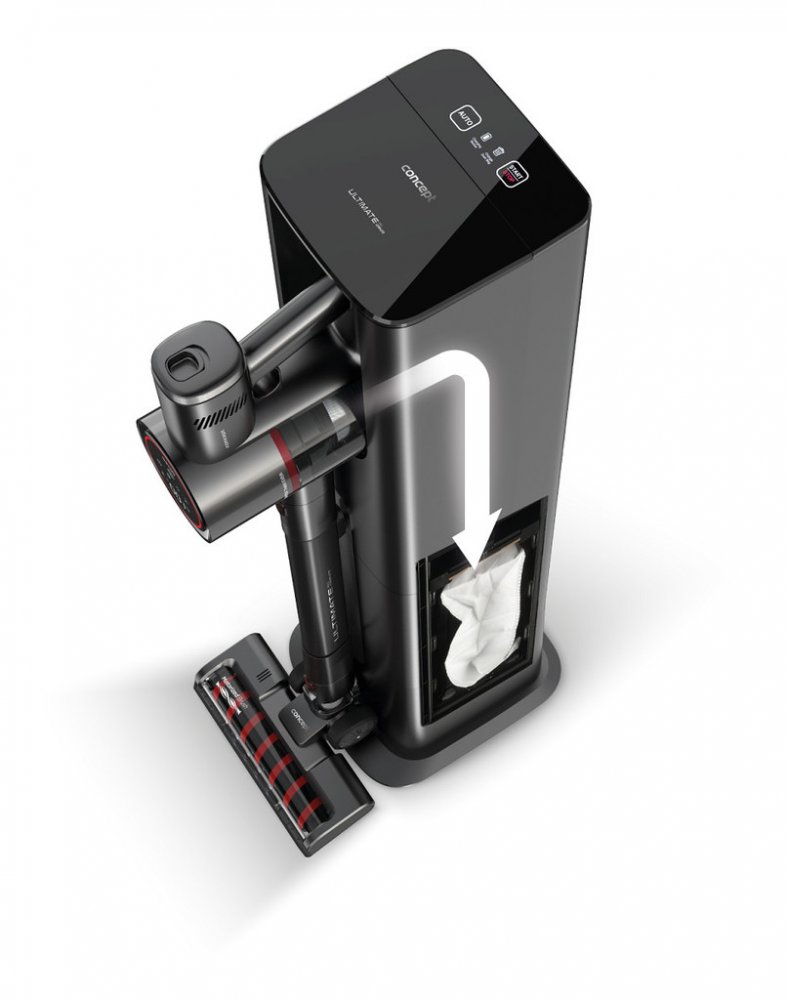 V okamžiku aktivovaného režimu AUTO vysavač automaticky vyprázdní prach a špínu z nádobky do sáčku umístěného uvnitř stanice, čímž minimalizuje nutnost ručního vyprazdňování. Tento systém zvyšuje uživatelský komfort a minimalizuje rozptylování nečistot zpět do vzduchu. Prachový sáček s kapacitou 3 l poskytuje vysavači dlouhodobý bezúdržbový provoz. Kromě vyprázdnění zásobníku se vysavač ve stanici také automaticky nabije.