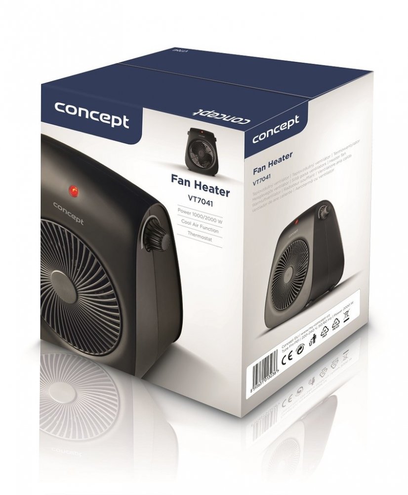 Teplovzdušný ventilátor Concept VT7041 2 provozní stupně Ventilátor Termostat Zahřeje i ochladí Teplovzdušný ventilátor Concept VT7041 se stane příjemným společníkem po celý rok. V zimě vás během okamžiku příjemně zahřeje a v horkých letních dnech poslouží jako ventilátor a zchladí vás studeným proudem vzduchu. Díky kompaktní velikosti a držadlu se s ním dobře manipuluje, takže ho lehce přemístíte kamkoliv potřebujete. Jednoduchá obsluha a bezpečný provoz Ventilátor disponuje 2 stupni topného výkonu a pomocí otočného termostatu můžete plynule nastavit požadovanou teplotu v místnosti. Pro maximální bezpečnost během používání je přístroj opatřen ochranou proti přehřátí a proti převrhnutí. Technické parametry: 2 stupně nastavení topného výkonu 1000/2000 W Plynule regulovatelný termostat Funkce proudění studeného vzduchu Světelná provozní kontrolka Ochrana proti přehřátí Ochrana proti převrhnutí Rukojeť pro snadné přenášení Příkon: 2000 W Napětí a frekvence: 220-240 V, 50 Hz Délka přívodního kabelu: 125 cm Rozměry: 21,2 x 14 x 26,8 cm Hlučnost: 47 dB Hmotnost: 1100 g Materiál: plast Barva: černá