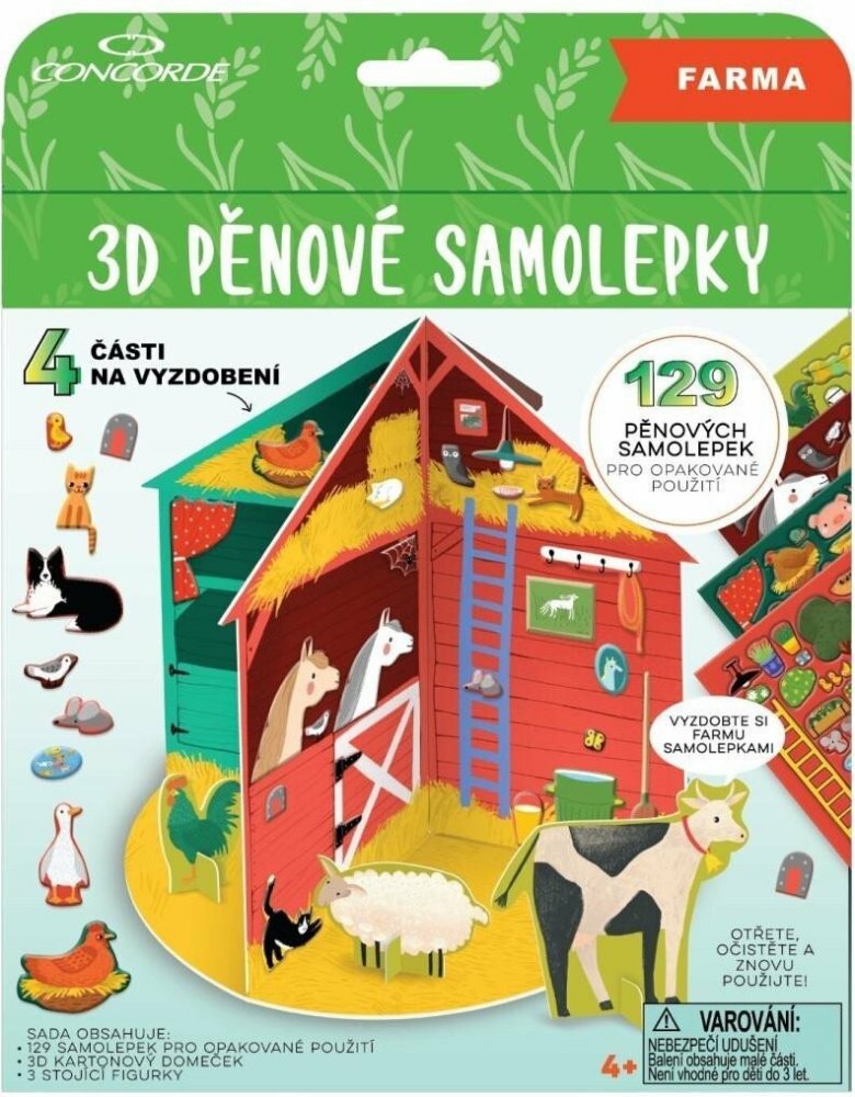 3D pěnové samolepky pro opakované použití. Set krásných samolepek a hrací 3D kartonový domeček s motivem farmy. Samolepky drží na hladké ploše bez lepidla. Lze je tedy opakovaně používat a přelepovat na hrací ploše nebo na různá hladká místa. Děti rozvíjí jemnou motoriku a zároveň si užijí plno zábavy. Skvělá aktivita pro vytváření si vlastního zábavného světa. Balení obsahuje 129 pěnových samolepek pro opakované použití, 3D hrací kartonový domeček (4 pokoje na vyzdobení) a 4 stojící figurky.