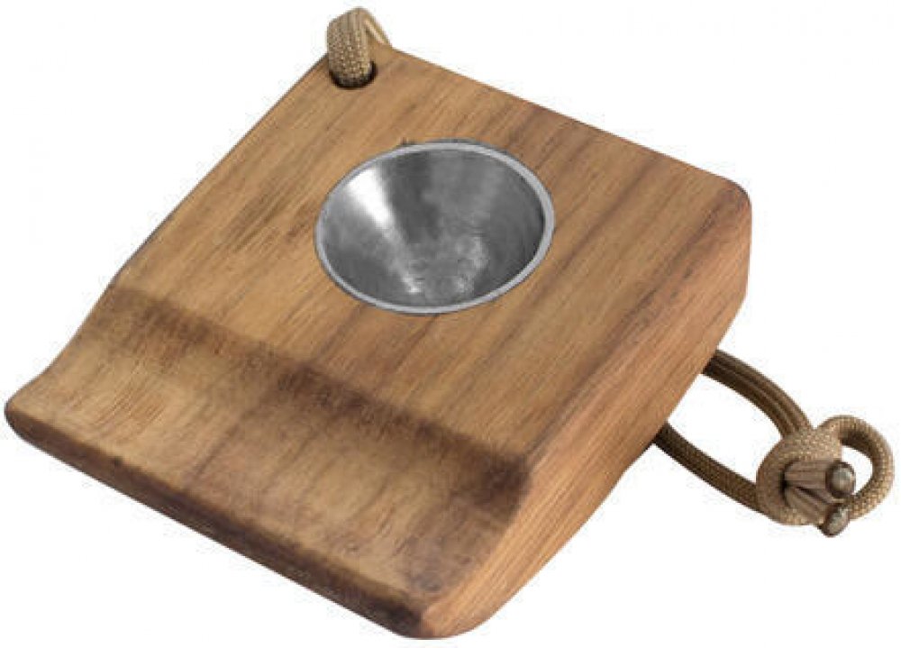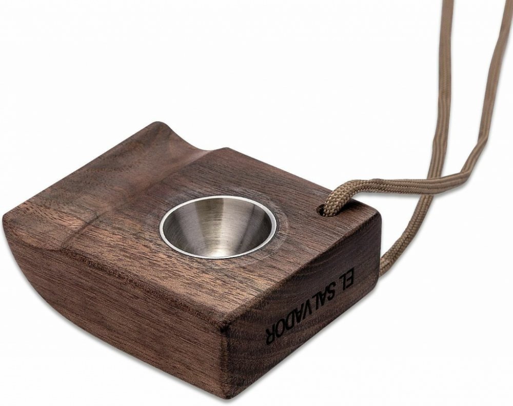 Je vyroben z ořechového dřeva a oceli. Na kraji je otvor na šňůrku s paracordem.