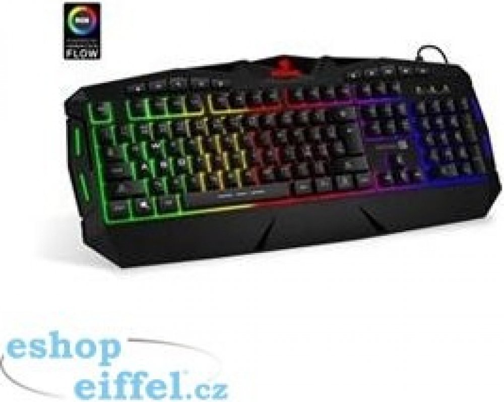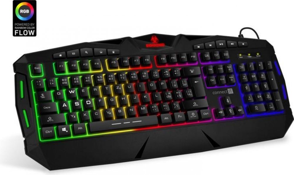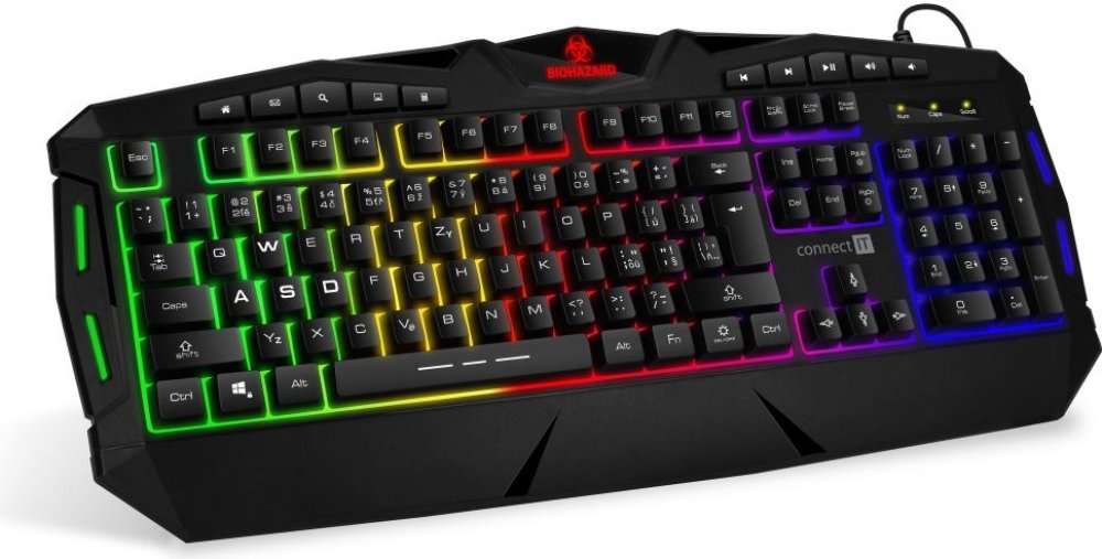 Profesionální gamingová klávesnice BIOHAZARD series pro hráče počítačových her v českém a slovenském layoutu s barevným rainbow podsvícení a pětistupňovou regulací intenzity podsvícení. K dispozici je 10 multimediálních kláves.