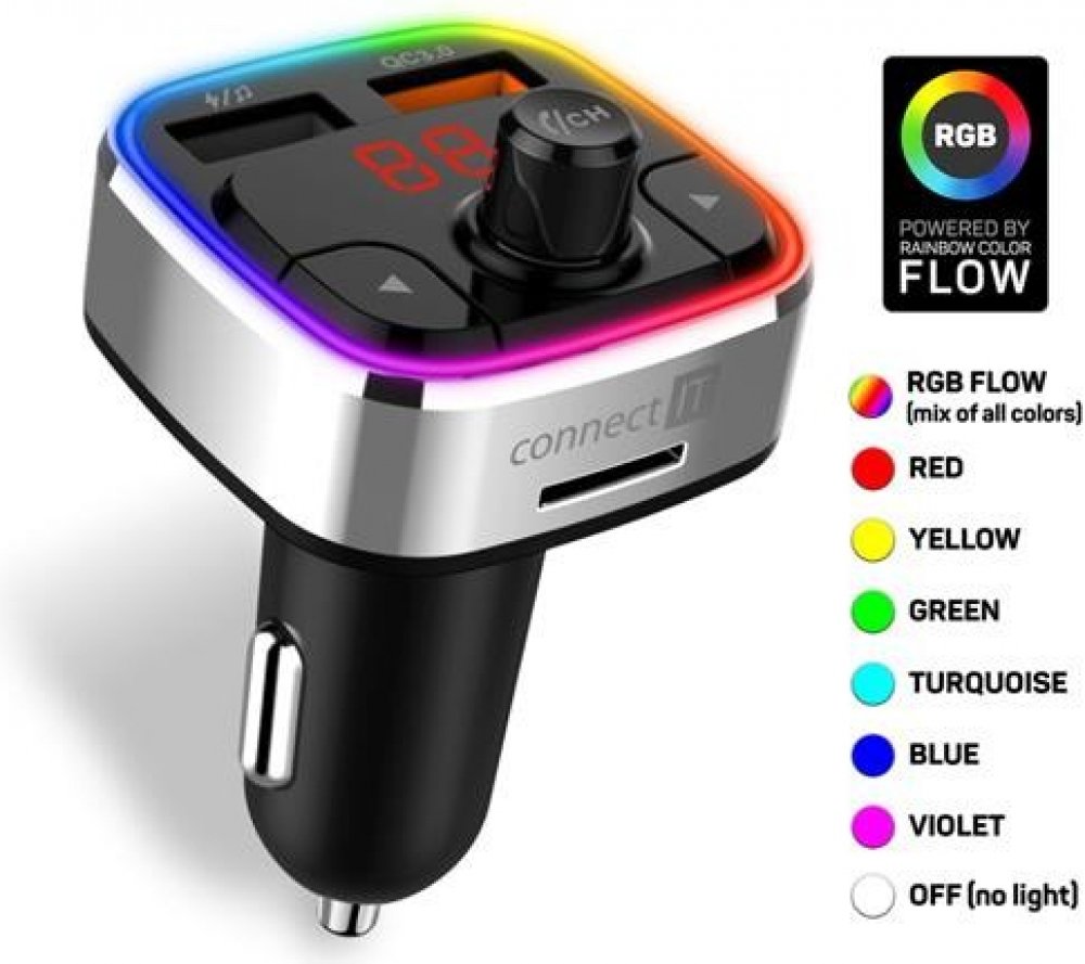 CONNECT IT CarRGB Bezdrátový FM transmitter, 2xUSB+MicroSD, STŘÍBRNÝ INCARZ TRANSMITTER RGB, Stříbrná --- Bluetooth transmitter CarRGB s multibarevným volitelným RGB podsvícením kombinuje tři zařízení v jednom - dvouportovou USB nabíječku, bezdrátové Bluetooth handsfree a hudební přehrávač. --- Bluetooth transmitter v kombinaci s dvouportovou nabíječkou je multifunkčí zařízení do vašeho automobilu, díky němuž můžete nejen nabíjet mobilní zařízení, ale také poslouchat hudbu ze svého USB flash disku, mobilního telefonu nebo paměťové karty. Transmitter je vybaven digitálním displejem a třemi ovládacími tlačítky pro jednoduché a komfortní ovládání všech funkcí. Navíc je možno připojit i paměťovou Micro SD kartu. Samozřejmostí u tohoto zařízení je i možnost bezdrátového spárování s vašim mobilním telefonem pro uskutečňování telefonních hovorů. Pro tento účel nechybí ani vestavěný mikrofon. --- Vhodný pro napájení i nabíjení mobilních telefonů, tabletů, navigací, kamer do auta, akčních kamer, elektronických čteček knih, MP3 přehrávačů, atd. Přehledný digitální LED displej s kontrastním červeným podsvícením Funkce bezdrátového handsfree: - příjem hovoru - ukončení hovoru - odmítnutí hovoru - opakované vytáčení posledního volaného čísla Funkce hudebního přehrávače: - přehrávání - pauza - následující a předchozí stopa - ovládání hlasitosti Paměť na udržení navolené frekvence i po vypnutí zapalování v automobilu nebo vytažení ze zásuvky Maximální podporovaná kapacita USB flash disku: 64 GB Vstup pro paměťovou Micro SD kartu (max. kapacita 64 GB) Přehrává hudební soubory MP3, WMA, WAV a FLAC Uživatelsky nastavitelné multibarevné RGB podsvícení 7 módů podsvícení: 1. Vypnuto (bez podsvícení) 2. Červené podsvícení 3. Žluté podsvícení 4. Zelené podsvícení 5. Tyrkysové podsvícení 6. Modré podsvícení 7. Fialové podsvícení 8. Duhové RGB podsvícení všemi barvami najednou Funkce udržení paměti volby barevného módu i po vypnutí zapalování v automobilu nebo vytažení ze zásuvky Podpora hlasové asistence Siri Možnost manuálního přepínání mezi USB flash diskem, paměťovou Micro SD kartou a Bluetooth Kompatibilní se všemi 12/24 V zásuvkami cigaretového zapalovače v osobních i nákladních automobilech Funkce "Dual USB Charging" umožňuje nabíjení dvou zařízení současně Max. výstupní proud 5,4 A si poradí i s nabíjením tabletů a ostatních náročnějších zařízení, kde 1 A proud pro nabíjení nestačí Bluetooth verze: V5.0 Podpora A2DP, AVRCP a HFP Rozsah FM frekvence: 87,5 - 108 MHz Rozsah Bluetooth frekvence: 2402 - 2480 MHz Výkon. 27 W Vstupní napětí 12 - 24 V DC (vhodná i pro zásuvky v karavanech a nákladních automobilech) Ultralehká konstrukce (hmotnost pouze 50 g) Čtyřnásobná bezpečnostní ochrana: - ochrana proti zkratu - ochrana proti přetížení - ochrana proti přehřátí - ochrana proti přebití připojeneého zařízení Certifikace CE, EMC, RoHS Rozměry (š × v × h): 45 × 82,5 × 44,5 mm Hmotnost: 50 g Barva: stříbrná --- Obsah balení: Transmitter Návod k obsluze