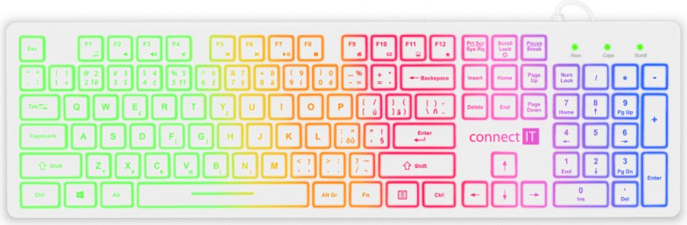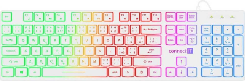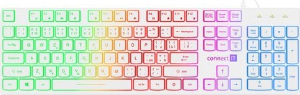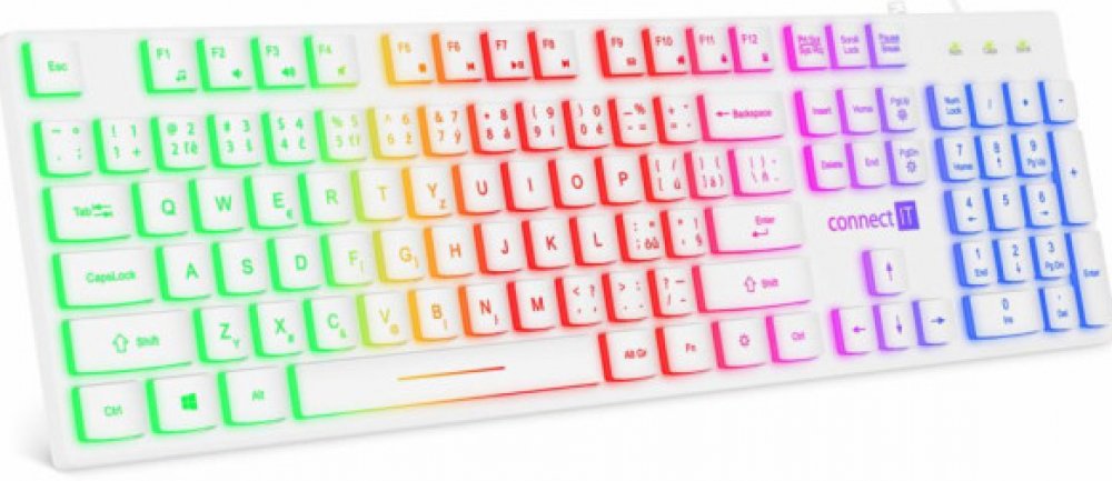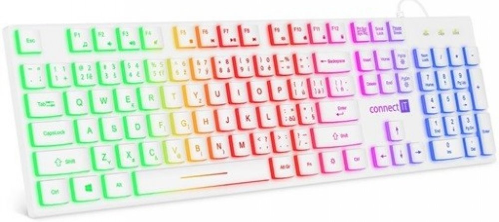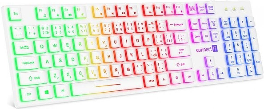 Klávesnice kromě klasických funkcí disponuje 12 multimediálními klávesami, které se obzvláště hodí do kancelářského prostředí. Její rainbow podsvícení vám umožní pracovat i v pozdních hodinách při nízkém osvětlení. Příjemný ergonomický náklon klávesnice pomáhá proti únavě zápěstí během dlouhých pracovních relacích.