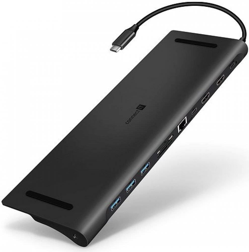 Prakticky tvarovaná USB-C dokovací stanice "Multi11in1" pro připojení až 11 periferií (2x USB-C, 2x HDMI, 3x USB-A, 3.5 mm jack, RJ45 Gigabit Ethernet. SD karta, MicroSD karta).