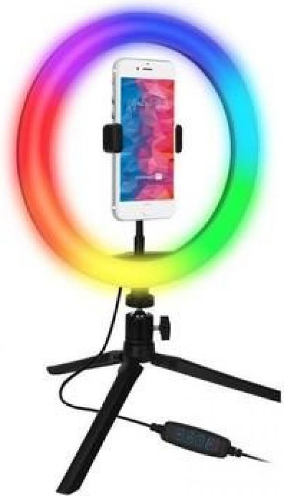 Stativ na mobil s prstencovým světlem • 168 RGB LED diod s 3 barevnými tóny (6500/4500/3000 K) • 12 statických barev • 9 dynamických efektů • Svítivost 1200 lm • Otočný kloub 360° • Pro telefon do šířky až 80 mm • Dálkové ovládání pro zapnutí/vypnutí a nastavení tónů a intenzity • Napájení přes USB–A 2.0