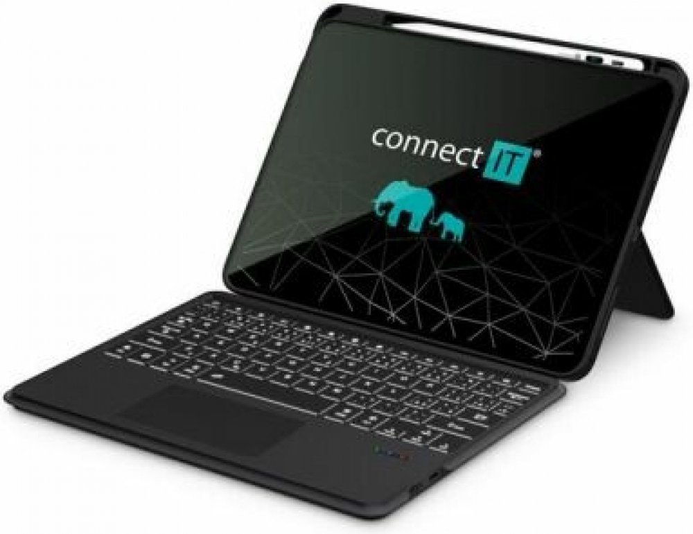 CONNECT IT TabCase podsvícená bezdrátová klávesnice s pouzdrem pro iPad 10.9" ČERNÁ TabCase BLACK --- TabCase podsvícená bezdrátová klávesnice s pouzdrem pro iPad 10. a 11. generace. Magnetické uchycení pouzdra ke klávesnici s možností zavření Vám dodá nejen pohodlí a flexibilitu při práci doma i v kanceláři, ale i maximální ochranu Vašeho tabletu před poškozením. --- Klávesnice nabízí 13 multimediálních a funkčních kláves, 7 barev LED podsvícení a touchpadem pro snadné a pohodlné ovládání. Pouzdro disponuje stojánkem s nastavitelným náklonem v horizontální i vertikální pozici, a zajistí tak maximální komfort při práci. Nechybí ani přihrádka na dotykové pero. --- Magnetická odnímatelná klávesnice Horizontální a vertikální stojánek Připojení: Bluetooth (5.0) 7 RGB LED podsvícení Materiál z PU kůže a silikonový kryt pro iPad Přihrádka na dotykové pero 13 multimediálních a funkčních kláves Baterie: Lithium 500 mAh Vstup: USB-C (DC5V/1A) Provozní doba: až 3 hodiny (s podsvícením) až 25 hodin (s vypnutým podsvícením) Doba nabíjení: až 3 hodiny Provozní dosah až 10 m Kompatibilita: iPad 10,9" (verze 10/11) - iPad 2022 (10th Gen): A2696/A2757/A2777/A3162 - iPad 2025 (11th Gen A16): A3354/A3355/A3356 Rozměry: 252 x 195 x 22 mm Hmotnost: 602 g --- Obsah balení: Klávesnice Ochranný kryt pro iPad Napájecí USB-C kabel Návod k obsluze
