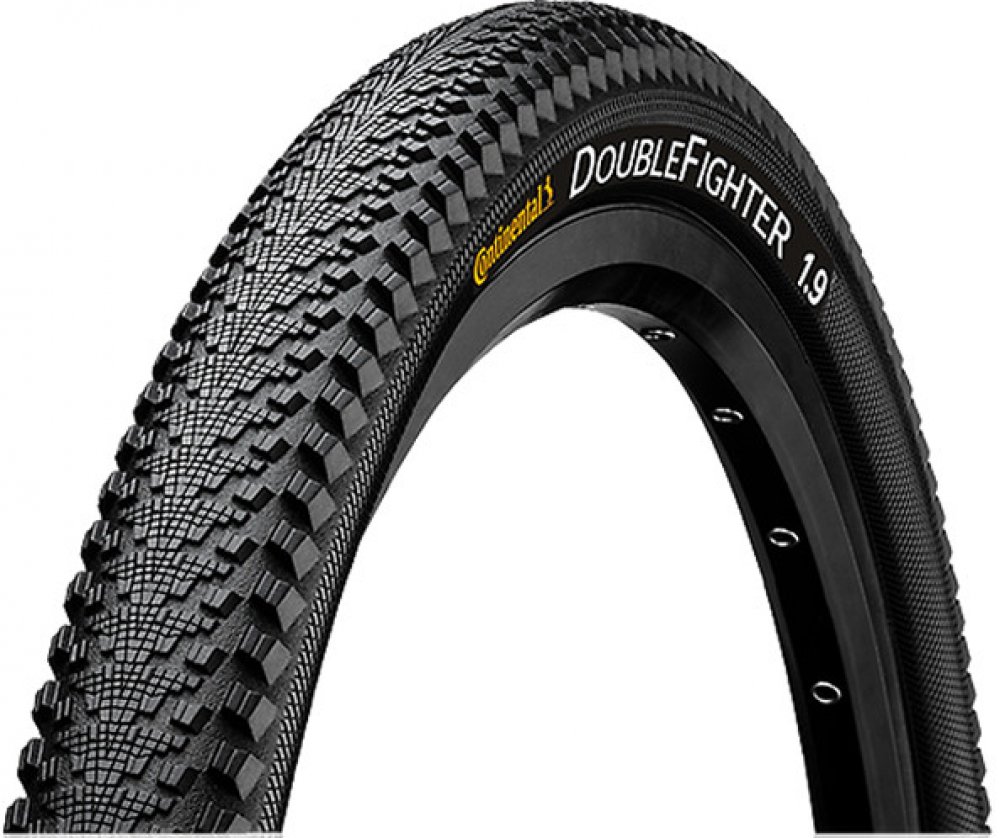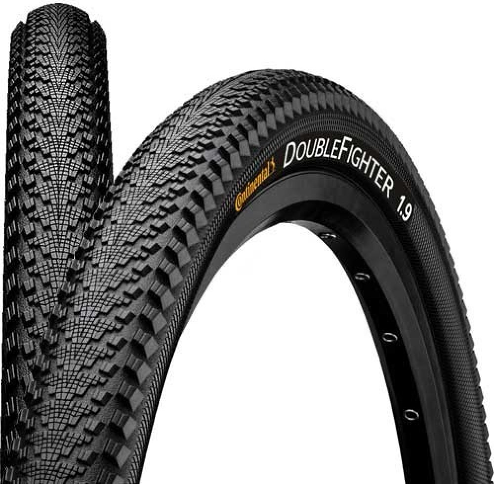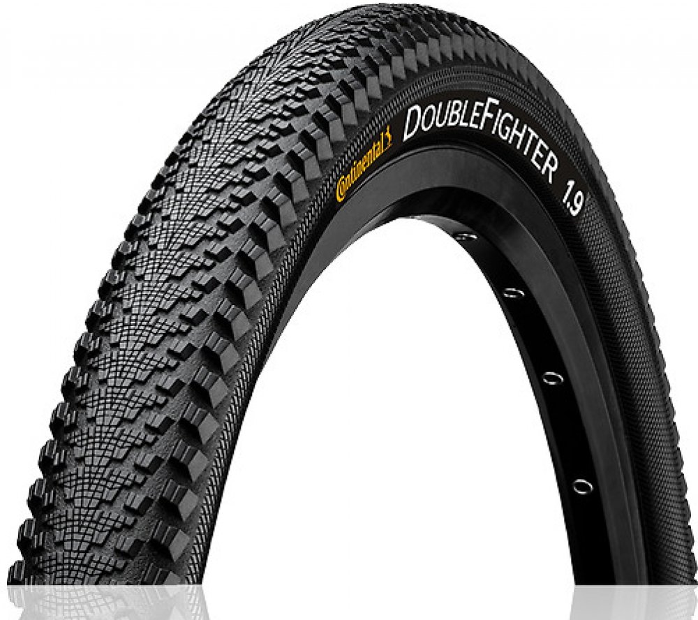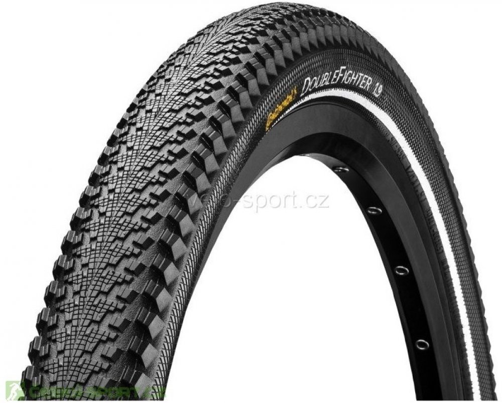 Plášť Continental Double Fighter - záměrem této pneumatiky je hlavně lehkost jízdy, ale díky bočním výstupkům na pneumatice dokáže projet i těžší a náročnější terén.