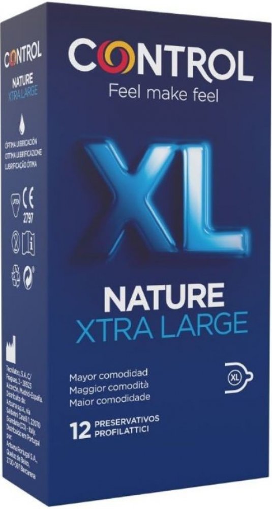 CONTROL ADAPTA NATURE XL CONDOMS 12 UNITS Transparentní kondomy z přírodního latexu s lubrikantem. Hladký válcový tvar s nádrží. Rozměry: Jmenovitá šířka: 57 mm. Délka: 190 mm. TloušĽka latexu: 0,06 mm. Jmenovitá šířka: 57 mm. Dermatologicky testováno. Krabice 12 kondomů.