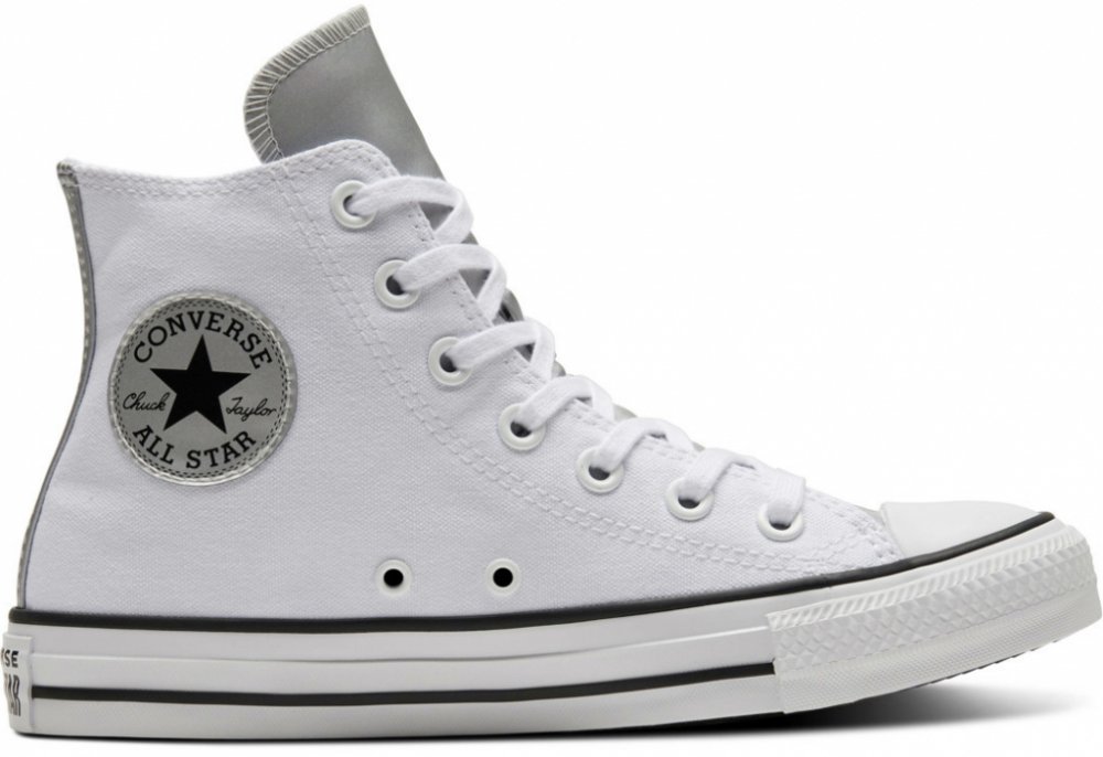 Dámské kotníkové kecky CHUCK TAYLOR ALL STAR vypadají v bílo stříbrné provedení opravdu skvěle. Z boku je kulaté stříbrné logo značky, které je také na patě podrážky. Jazyk a pruh na zadní části kecek je stříbrné barvy. Na boku nalezneš dvě praktické dírky. Jsou vhodné pro volný čas. Materiál: textil, guma