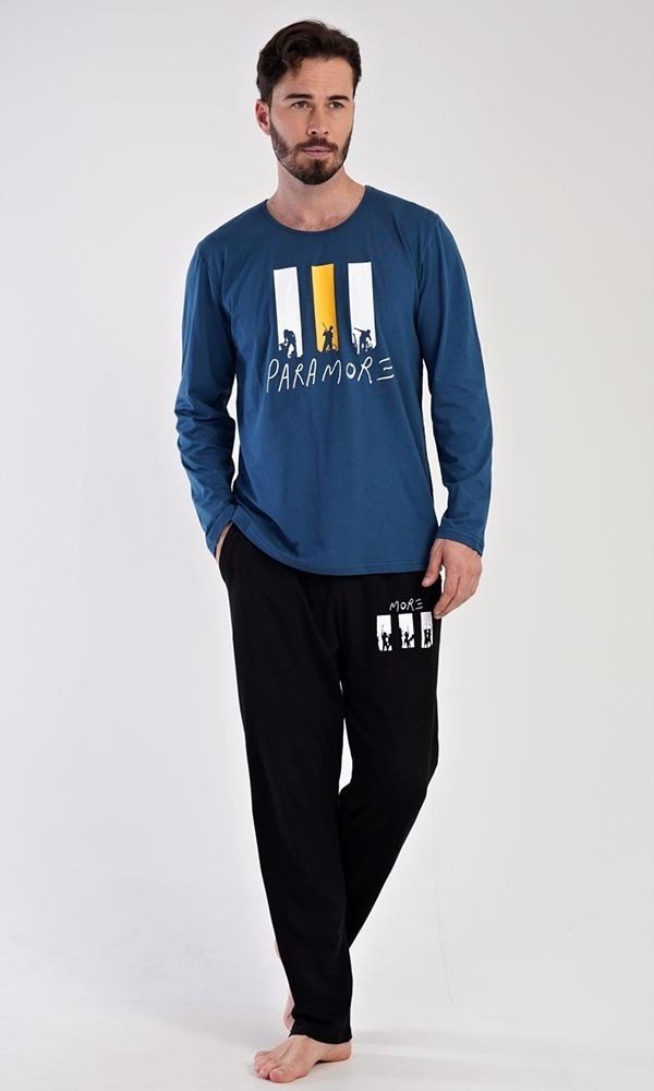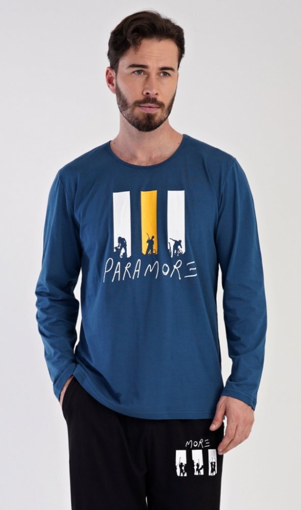 Užijte si pohodlí a styl s pánským pyžamem Oliver, vyrobeným ze 100% bavlny. Pyžamo se skládá z jednobarevného trika s dlouhým rukávem a kulatým výstřihem, které zdobí obrázky rockové kapely a výrazný nápis PARAMORE. Tento motiv se opakuje také na dlouhých kalhotách, které jsou vybaveny gumou v pase, šňůrkou na stažení a praktickými kapsami.