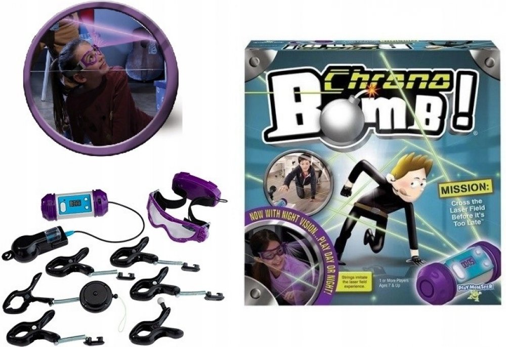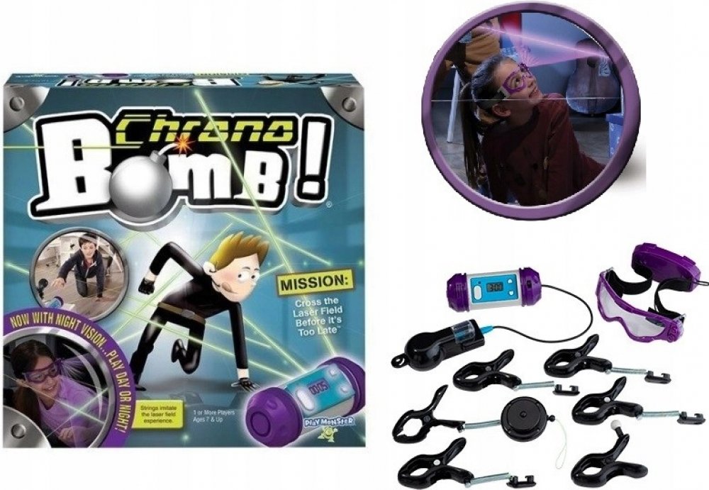 Mrštnost. Rychlost. Obratnost. Opatrnost. To jsou ty nejdůležitější předpoklady k tomu, jak úspěšně zneškodnit časovanou bombu. Překonejte laserové bludiště a zachraňte svět. Chrono bomb je akční hra pro 1 a více hráčů. Natáhněte libovolně po pokoji provázky a prověřte svou rychlost a obratnost. Propleťte se laserovým bludištěm, aniž byste se dotkli provázku a dostaňte se k bombě dřív, než vybuchne. Máte možnost si zvolit ze dvou her: Trénink nebo Odpočítávání. Při první hře máte šanci zneškodnit bombu v neomezeném čase. Zvolíte-li druhou hru, můžete si nastavit časový limit v rozmezí 30 vteřin až 10 minut. Pozor, v případě obou her je každý dotek provázku penalizován. Užijte si ještě víc zábavy s novou verzí hry. Natáhněte laserové bludiště v tmavé místnosti, použijte UV baterku, posviťte si na provázky, protáhněte se bludištěm a zneškodněte bombu jako první.
