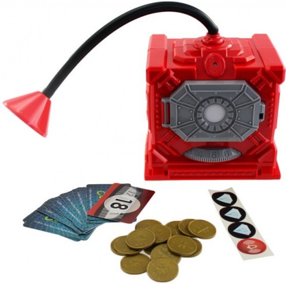 Obsah balení: trezor, stetoskop, 15 mincí, 18 herních karet, 3 diamanty (mince se samolepkou diamantu), alarm (mince se samolepkou alarm) a návod.