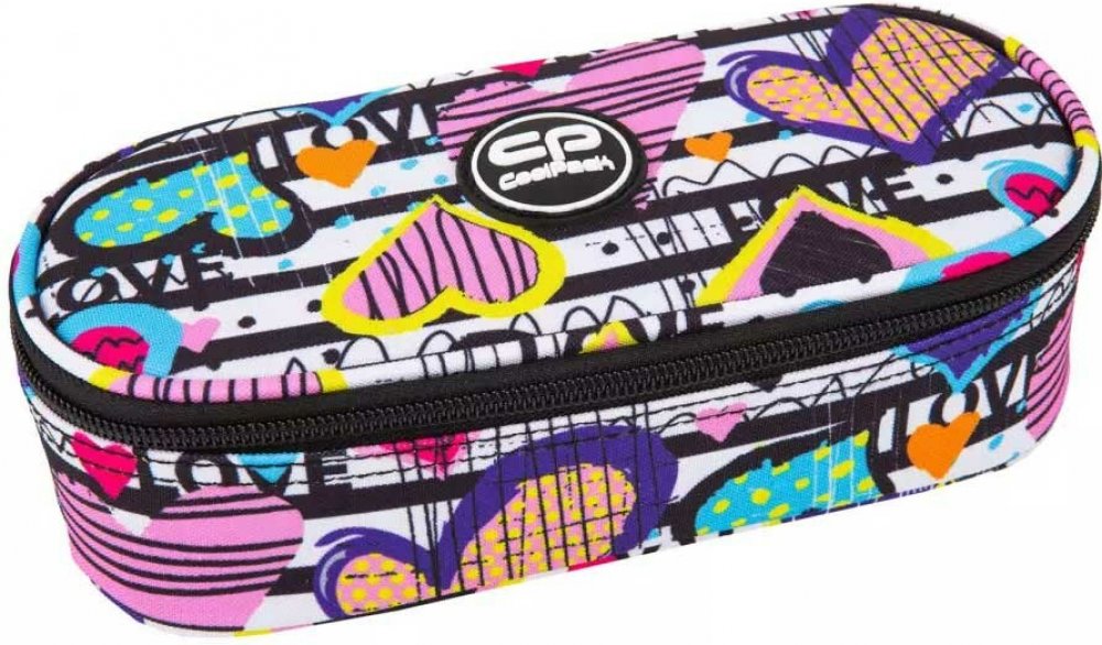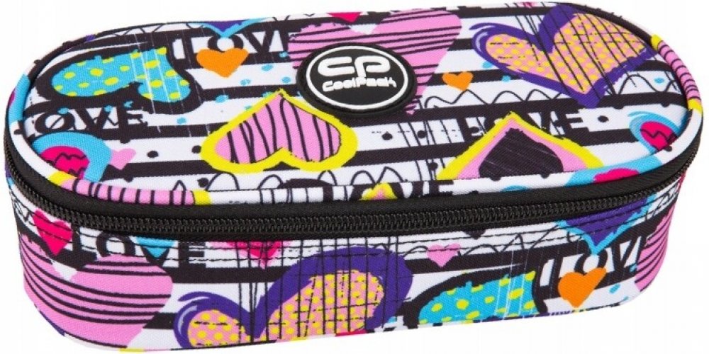 Penál je vyroben v příjemném barevném provedení s motivem barevných srdíček.