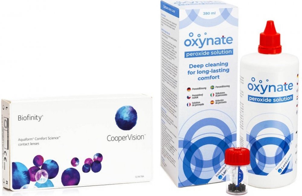 Měsíční kontaktní čočky Biofinity nabízíme ve zvýhodněném balíčku s peroxidovým roztokem Oxynate Peroxide 380 ml. Biofinity jsou moderní silikon-hydrogelové kontaktní čočky, které spolu s nadprůměrnou propustností pro kyslík nabízejí současně vysoký obsah vody. Dopřejte si luxus s měsíčními čočkami Biofinity od společnosti CooperVision. Jedinečná technologie Aquaform zajistí vašim očím po celý den...