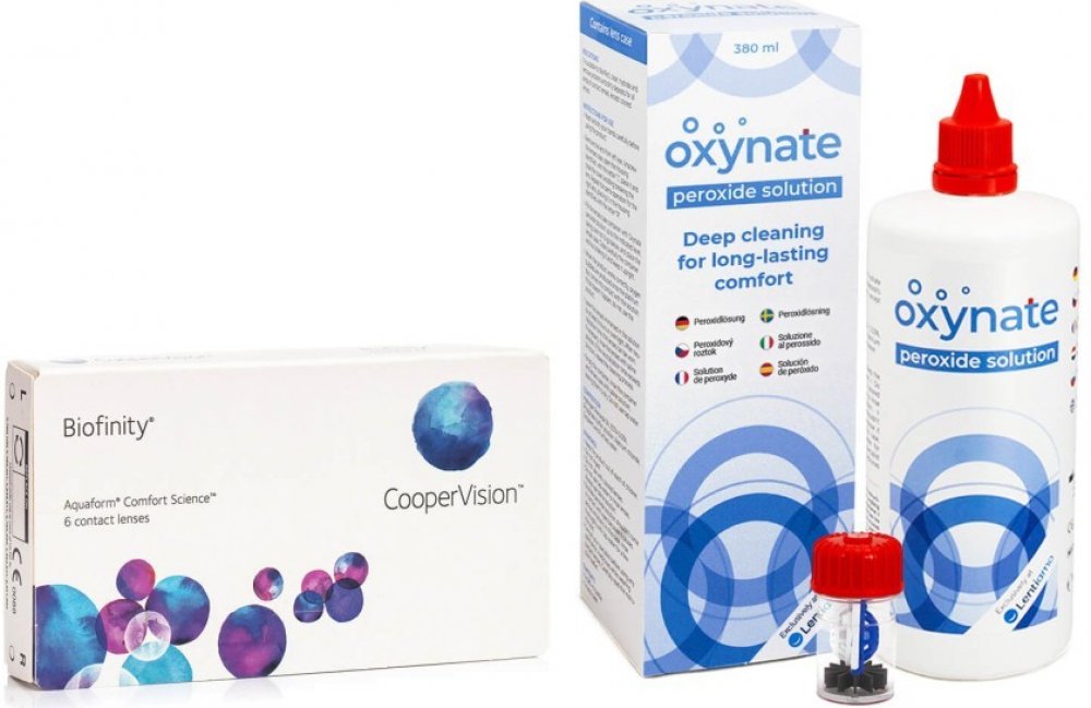Měsíční kontaktní čočky Biofinity nabízíme ve zvýhodněném balíčku s peroxidovým roztokem Oxynate Peroxide 380 ml. Biofinity jsou moderní silikon-hydrogelové kontaktní čočky, které spolu s nadprůměrnou propustností pro kyslík nabízejí současně vysoký obsah vody. Dopřejte si luxus s měsíčními čočkami Biofinity od společnosti CooperVision. Jedinečná technologie Aquaform zajistí vašim očím po celý den...