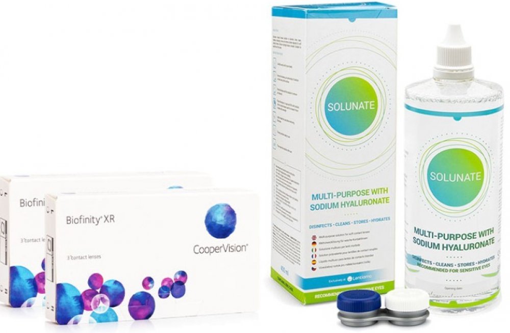 Měsíční kontaktní čočky Biofinity XR nabízíme ve zvýhodněném balíčku s roztokem Solunate Multi-Purpose 400 ml. Biofinity XR jsou měsíční silikon-hydrogelové kontaktní čočky s unikátní technologií výroby AQUAFORM™. Tato revoluční technologie využívá silikonový monomer, který umožňuje mnohem efektivnější propustnost kyslíku. Materiál čoček Biofinity XR je neionogenní. Na povrchu nejsou místa vykazující náboj, proto se na něj proteiny téměř nevážou. Hladký, dokonale smáčivý povrch kontaktních čoček Biofinity XR významně redukuje usazování lipidových depozit. Výhodou čoček Biofinity XR je asférická přední plocha, která zlepšuje optické vlastnosti čočky obzvláště ostrost vidění za horších světelných podmínek a umožňuje korekci nižšího astigmatismu a presbyopie. Čočky Biofinity XR jsou určeny pro korekci vysokých dioptrií jak plusových, tak i minusových. Kontaktní čočky Biofinity XR jsou určeny k dennímu způsobu nošení. Na doporučení lékaře lze však čočky nosit i kontinuálně. Solunate je nový víceúčelový roztok italské výroby, který uživatelům kromě vysoké kvality nabízí i ekonomicky výhodné balení za příznivou cenu. Větší balení 400 ml vám poskytne možnost používat roztok o 5 dní déle než roztoky v běžné velikosti (360 ml) a to za srovnatelnou cenu. Optimální poměr kvality a ceny řadí roztok Solunate mezi velmi oblíbené roztoky na trhu. Solunate je jedním z nejprodávanějších roztoků v našem e-shopu a je skvělou alternativou pro jiné univerzální roztoky jako jsou například ReNu MPS Sensitive Eyes, Biotrue Multi-Purpose nebo řada OPTI-FREE. Univerzální roztok Solunate s obsahem kyseliny hyaluronové je určený k čištění, dezinfekci, zvlhčování, oplachování a uchovávání všech měkkých kontaktních čoček včetně silikon-hydrogelových. Roztok odstraňuje bílkovinové usazeniny a je vhodný pro citlivé a suché oči. Složení roztoku Solunate je optimálně vyvážené – zaručuje dostatečnou účinnost a zároveň minimalizuje podráždění oka. Díky složení s obsahem kyseliny hyaluronové má roztok Solunate schopnost dlouhodobé hydratace a zabraňuje tak nepříjemnému pocitu suchého oka. Kyselina hyaluronová má vynikající schopnost vázat vodu a v roztoku funguje jako vysoce efektivní lubrikant. Na oku vytváří ochranný film, který snižuje tření mezi očním víčkem a rohovkou, což je blahodárné pro podrážděné a suché oči. Kontaktní čočky tak vydrží dostatečně hydratované po celý den a jejich nošení je ještě pohodlnější a komfortnější. Součástí balení roztoku Solunate je také pouzdro na kontaktní čočky, které je inovativně umístěno přímo na lahvi roztoku a stává se tak její součástí. Díky tomu máte pouzdro při použití roztoku vždy k dispozici a nikdy se vám při cestách neztratí.