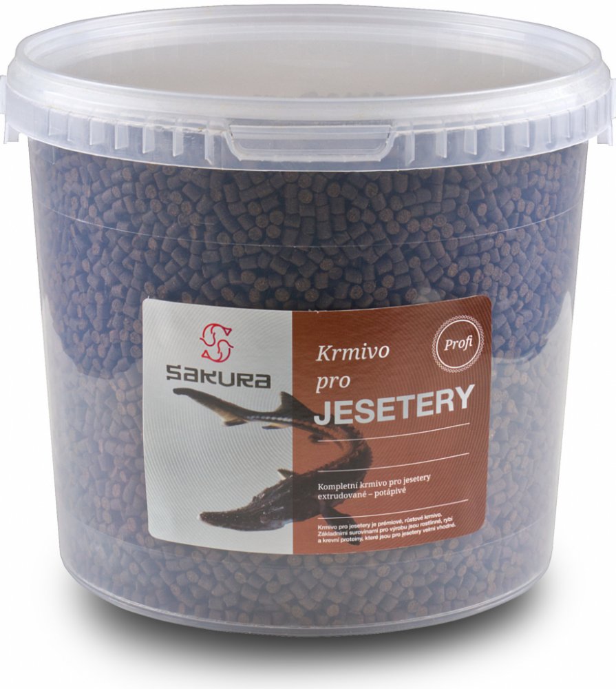 Krmivo pro jesetery 4,5 mm kbelík 5 l (3600 g)Kompletní prémiové potápivé krmivo pro jeseterovité ryby s velikostí granulí 4,5 mm je vyrobeno z kvalitních surovin, které zahrnují rostlinné, rybí a krevní proteiny. Vhodné pro jesetery velikosti do 100 cm.Hlavní vlastnosti a výhody Krmivo je formulováno tak, aby poskytovalo všechny nutriční potřeby jeseterovitých ryb, podporovalo jejich zdraví a udržovalo je ve skvělé kondici Vybrané ingredience zajišťují, že krmivo je snadno stravitelné, což napomáhá k udržení čisté a zdravé vody v jezírkuNutriční hodnotyBílkoviny: 45%Podporuje zdravý růst a vývoj rybTuky: 15%Zajišťuje energii a podporuje zdravý nervový systémVláknina: 3,2%Napomáhá k trávení a udržení zdravého trávicího traktuPopel: 6,5% Obsahuje minerály nezbytné pro zdraví rybFosfor: 1,1%Důležitý pro energetický metabolismus a zdravé kostiVitamínyVitamín A: 10 000 IU/kgPodporuje zrak a funkci imunitního systémuVitamín D3: 1 250 IU/kgNezbytný pro zdravé kosti a absorpci vápníkuI: Jodičnan vápenatý: 3 mg/kgPodporuje růst a vývoj ryb. Zvýšení odolnosti vůči nemocem a stresuMn: Chelát manganu: 12 mg/kg Posiluje nervový a imunitní systémZn: Zinc chelate 50 mg/kg Zinek je důležitý pro reprodukční zdraví ryb a pro zdraví pokožky a šupin rybCu: Oxid měďnatý: 5 mg/kg Podpora tvorby červených krvinekMinerályVápník: 0,9%Důležitý pro zdravý růst kostí a správnou funkci svalůSodík: 0,2%Podporuje správné nervové a svalové funkceDoporučené krmeníPro nejlepší výsledky a zdraví ryb krmit denně v množství, které ryby zkonzumují během 10 až 15 minut. Toto dávkování zajistí, že voda zůstane čistá a nezatížená nadbytečným krmivem.