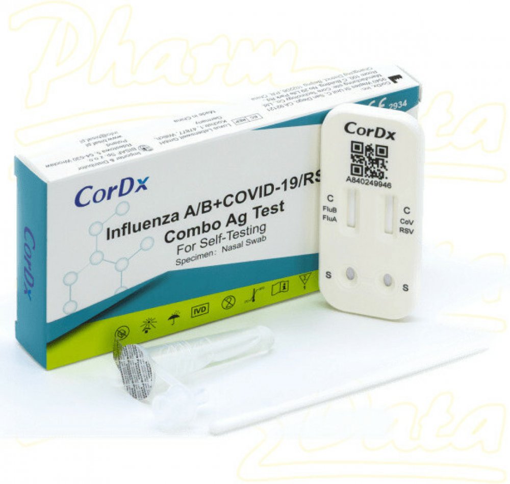 Rychlý test na chřipku a další respirační onemocnění určený pro domácí použití. Tento kombinovaný chřipka test umožňuje současnou detekci čtyř běžných respiračních virů: SARS-CoV-2, chřipka A, chřipka B a RSV – z jednoho výtěru. Výsledek je k dispozici již do 10 minut, bez nutnosti laboratorního vybavení. Vhodný pro domácí použití (samotestování).Patogeny: SARS-CoV-2 covidchřipka Achřipka BRSVTyp odběru: výtěr z nosuPatogenMíra pozitivní koincidenceMíra negativní koincidenceCelková míra koincidenceSARS-CoV-298,67 %100 %97,86 %Chřipka A100 %99,34 %99,43 %Chřipka B96,00 %99,67 %99,15 %RSV98,98 %99,21 %99,14 %Balení obsahuje:1× testovací kazeta1× sterilní odběrový tampon1× zkumavka s pufrem a víčkem1× držák zkumavek1× příbalový leták