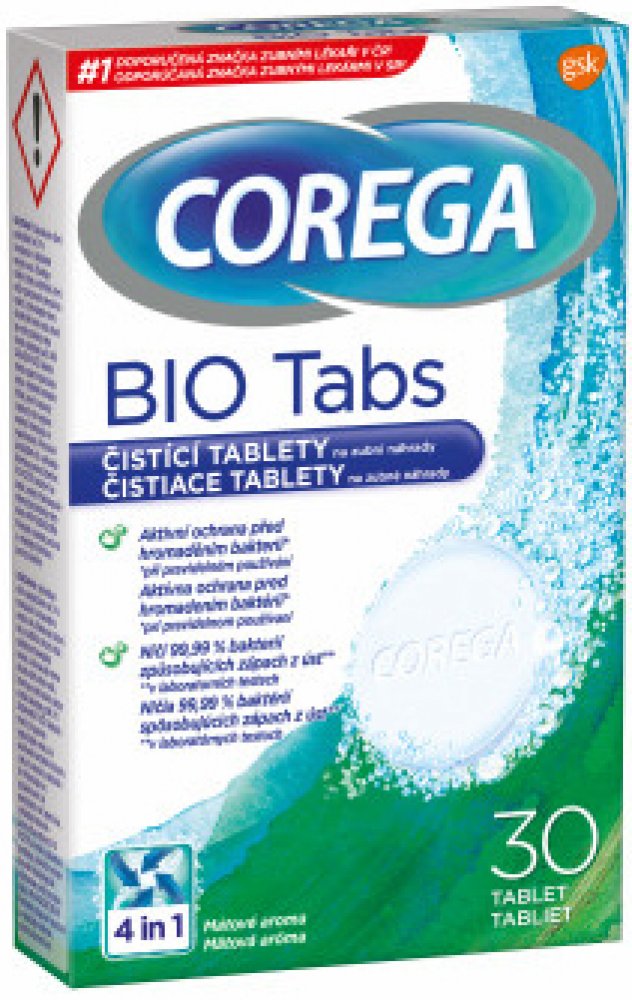 Čisticí tablety Corega jsou vhodné pro každodenní hygienu zubní náhrady. Corega Bio antibakteriální tablety ničí 99,9 % bakterií způsobujících nepříjemný zápach z úst. Důkladně vyčistí zubní náhradu během 3-5 minut. Síla tablet pronikne i na místa, která jsou kartáčkem špatně dostupná. Pomáhají odstranit zubní plak a skvrny od čaje nebo kávy. Neabrazivní složení je šetrné k zubní náhradě.