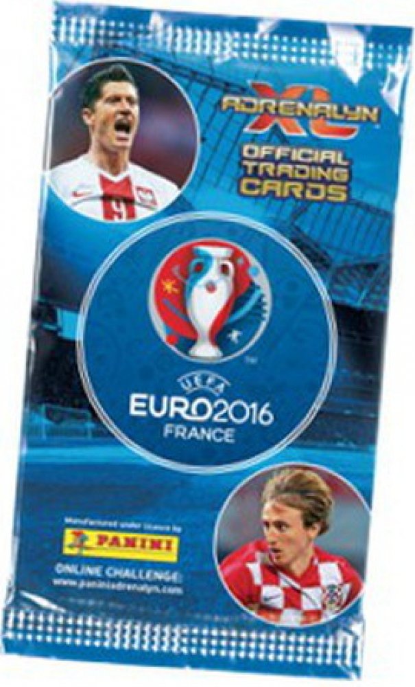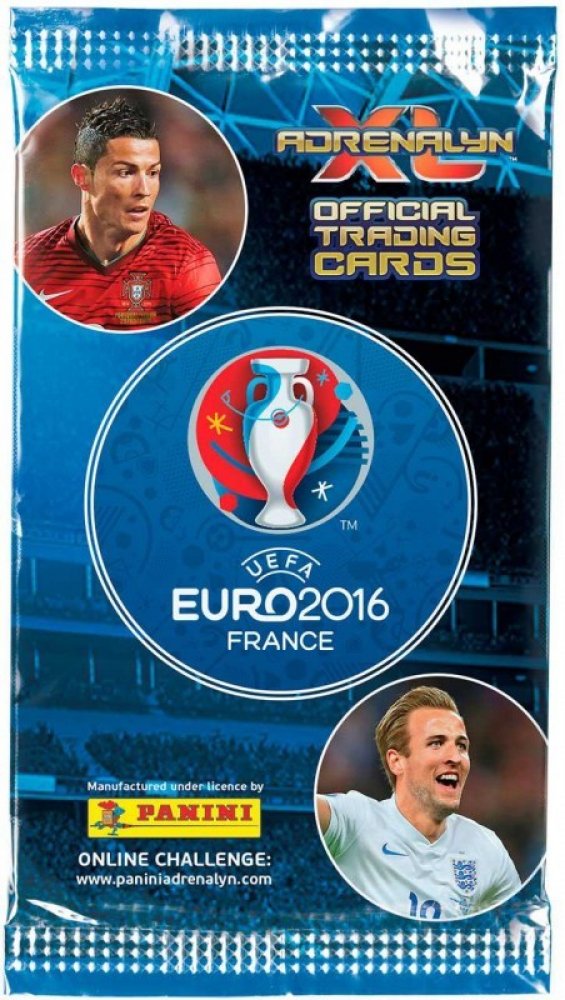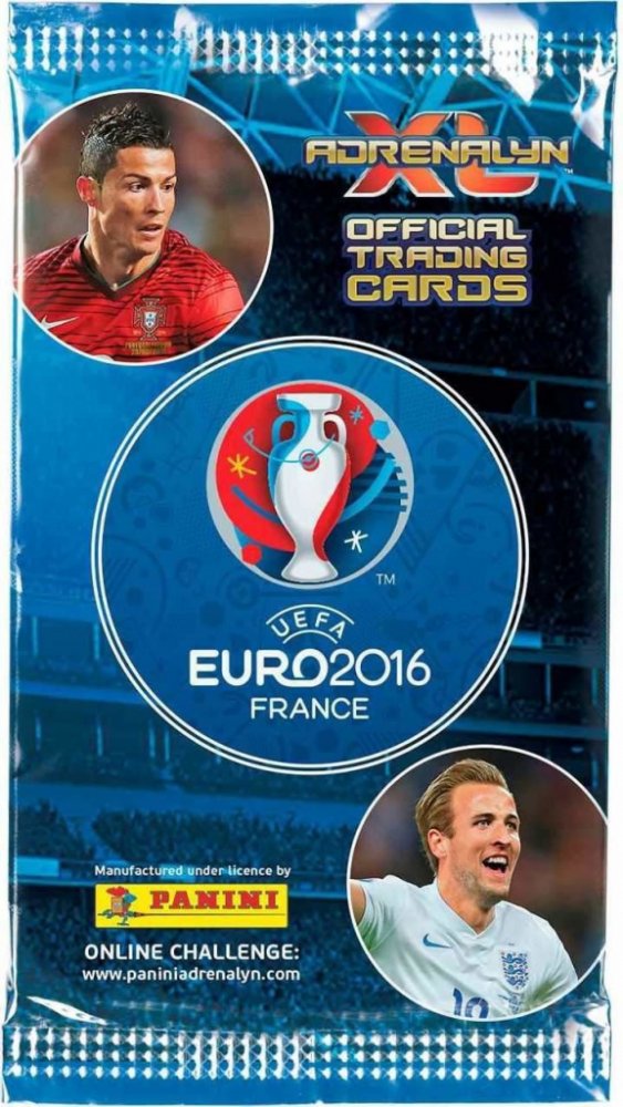 Sběratelské karty Euro 2016. Každý balíček obsahuje 6 karet. Datum vydání: březen 2016.