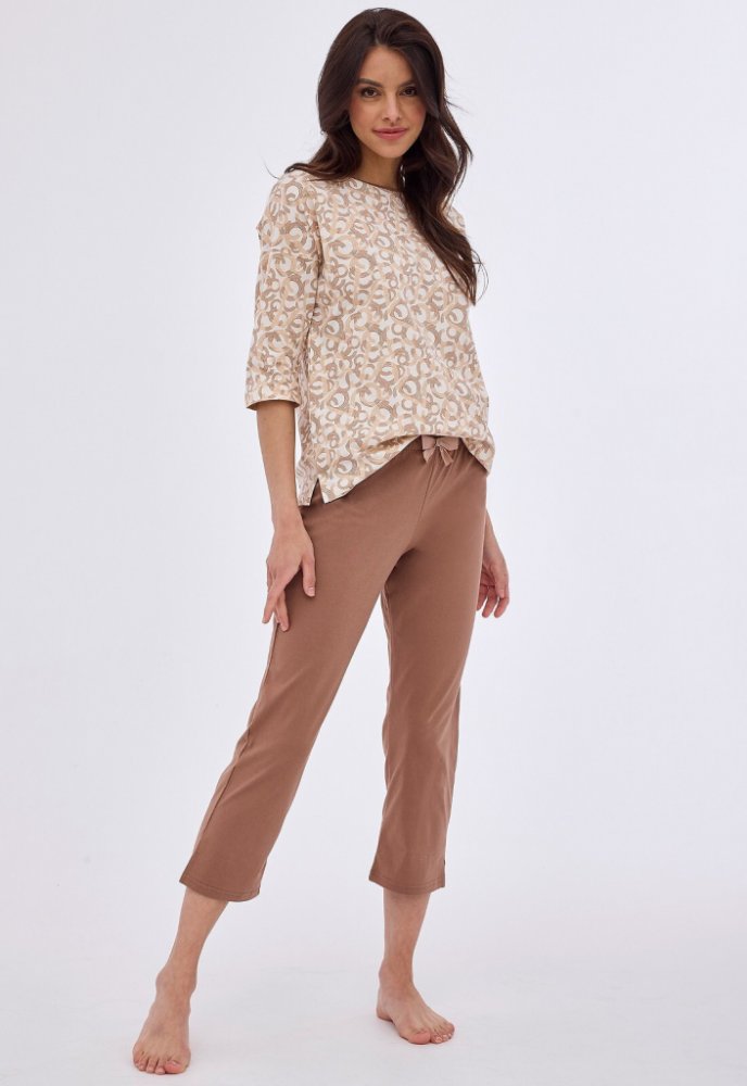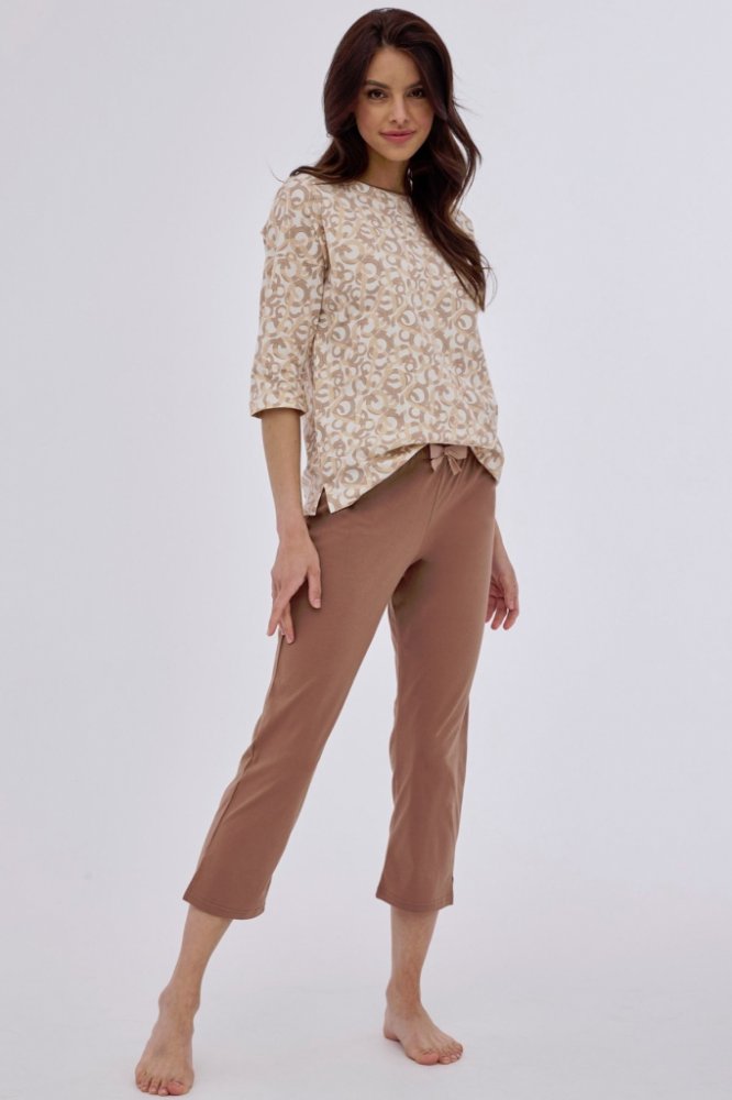 Dámské pyžamo Ines. Kombinace stylu a elegance. Horní díl je ozdoben trendy vzorem, který dodává pyžamu šmrnc a moderní vzhled. 3/4 rukávy zajišťují svobodu pohybu a pohodlí, zatímco hladké hnědé kalhoty s elegantní mašlí působí velmi šik. Jejich 7/8 délka vám dodá neomezenou volnost pohybu. Tento pečlivě navržený komplet spojuje v sobě komfortní nošení s atraktivním vzhledem. Jednoduše se v něm b...
