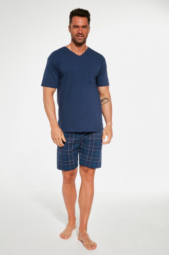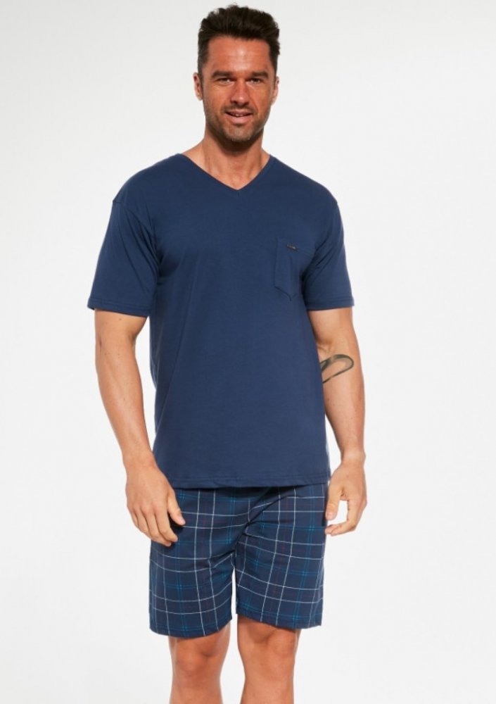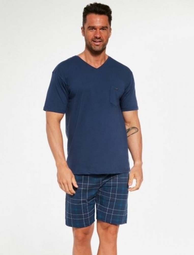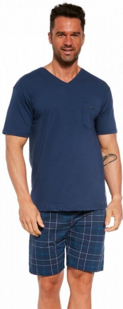 Pohodlné bavlněné pánské pyžamo s krátkým rukávem od značky Cornette. Vrchní díl má výstřih do V a na přední straně našitou kapsičku s logem Cornette. V pase je všitá pohodlná guma.