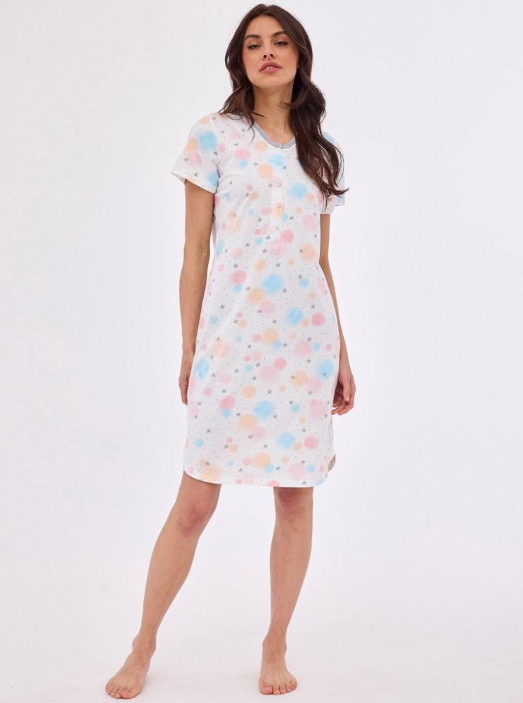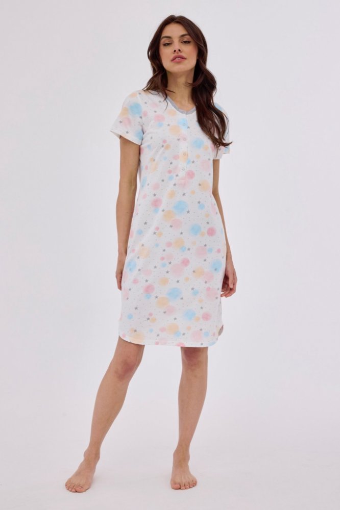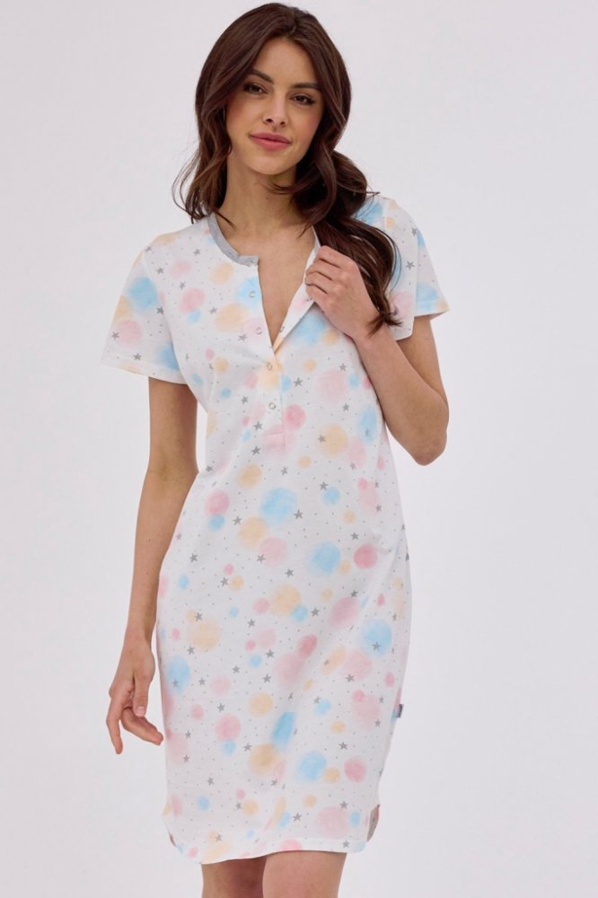 - vysoce kvalitní bavlna- zdobené pastelovým vzorem- krátký rukáv- kulatý výstřih, zapínání na patentky- délka po kolena- model je ideální i pro kojící maminky