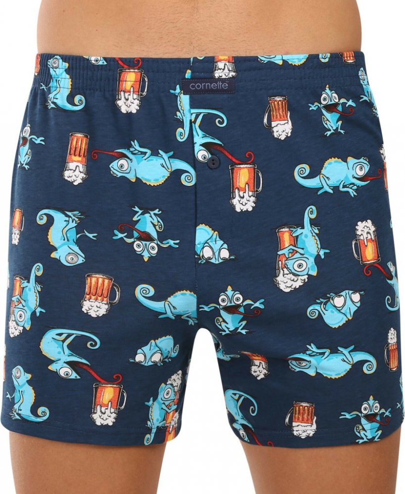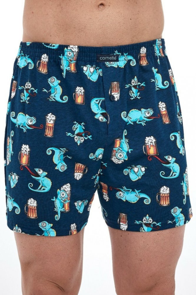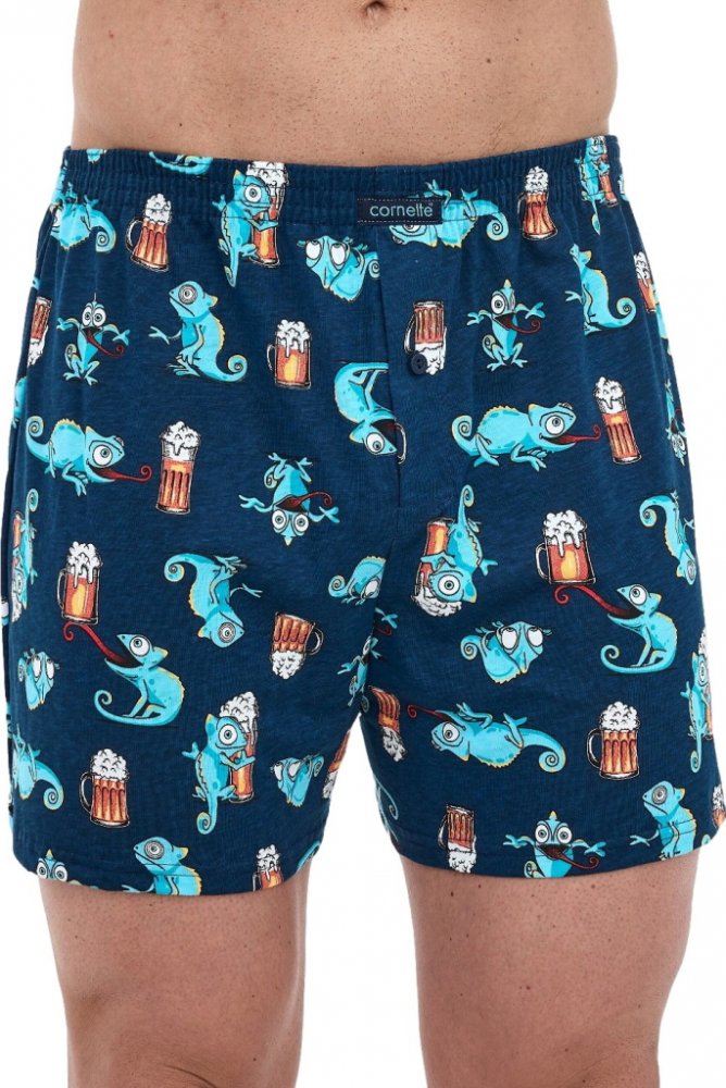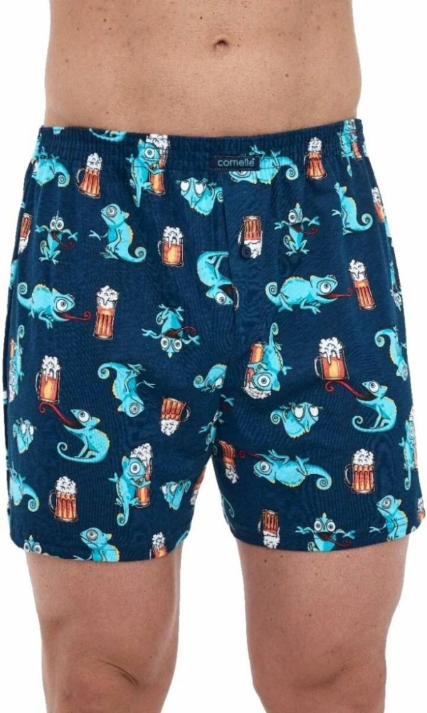 Boxerky zdobí humorný, barevný potisk zobrazující chameleony v doprovodu pivních půllitrů, viditelný po celé ploše materiálu. Vzor dodává produktu jedinečný, zábavný charakter a činí tento model skvělým originálním dárkem.