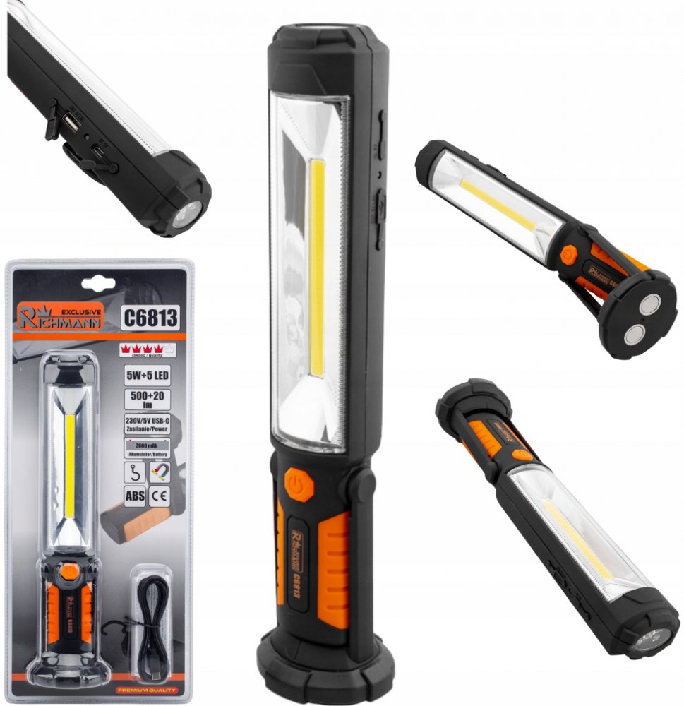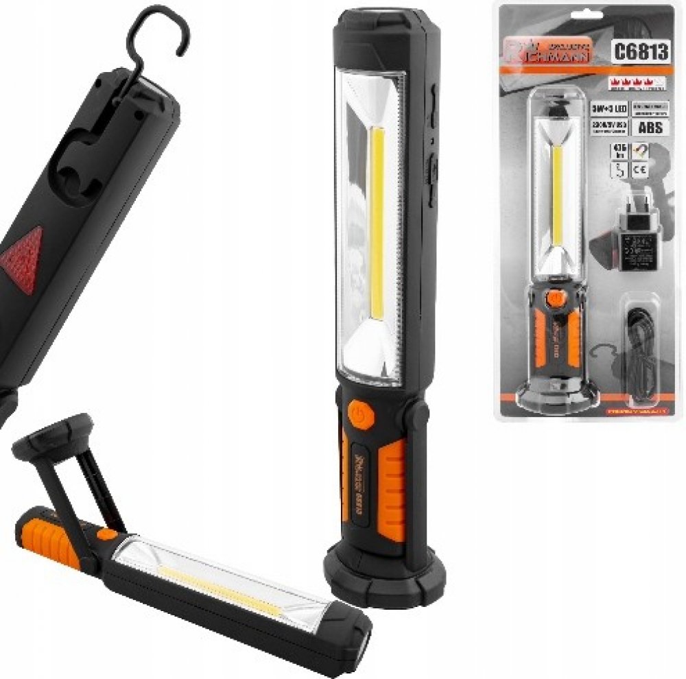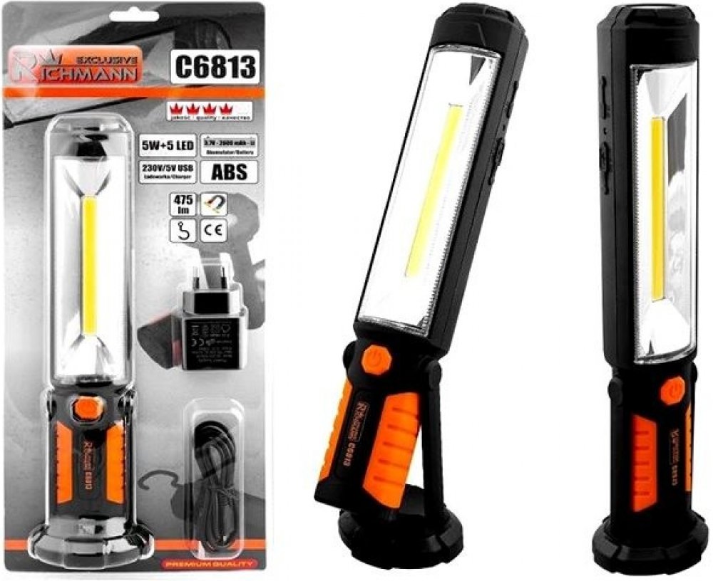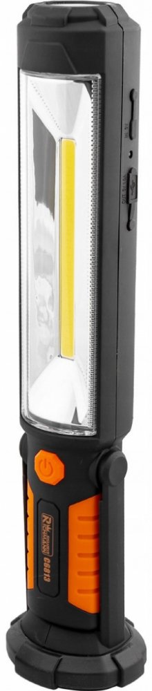 Svítilna pracovní prodloužená COB-LED 5W plus 5 LEDEnergeticky úsporná COB-LED dioda s vysokou svítivostí a životností. Robustní obal s vestavěným akumulátorem 3,7V 2000mAh - Li s životností více než 500 cyklů nabití. Silný magnet a otočný háček pro různé druhy použití. baterie 3.7V 2000 mAh-Li
