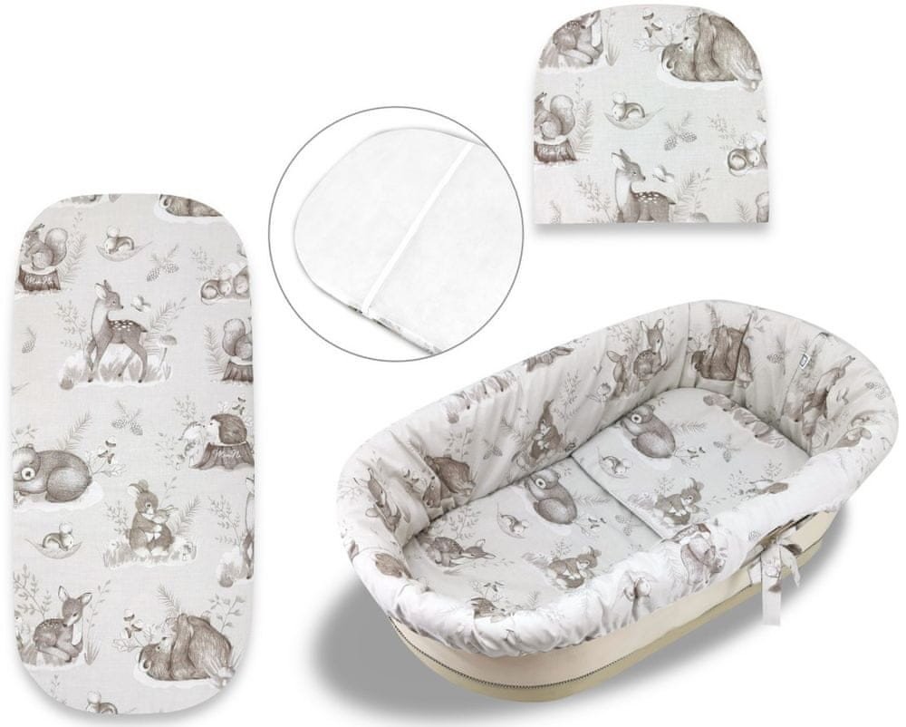 Boky jsou vyplněné polyesterovou, netkanou textilií, zajišťující bezpečnost, pohodlí a minimalizuje riziko nárazu. Všitá guma navíc umožňuje přizpůsobit obvod vložky ke každé hluboké korbě nebo košíku, díky čemuž je stabilně uchycena. Polštář a matrace dokonale doplňují sestavu a tvoří tak krásný celek.